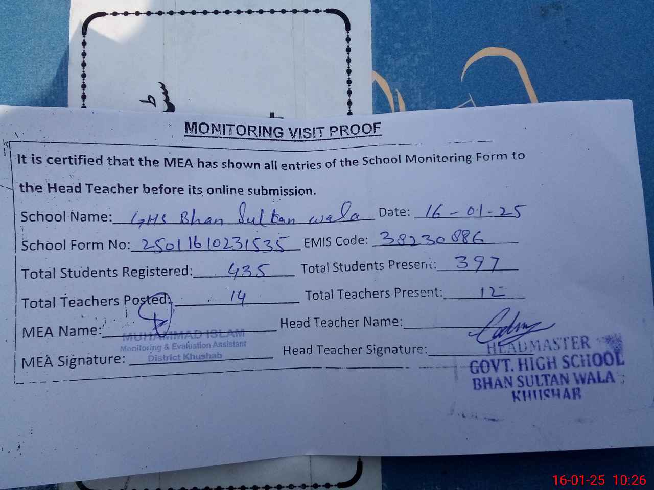 | EMIS Code: 38230886 | Name of School: GHS BHAN SULTAN WALA KHUSHAB | |||