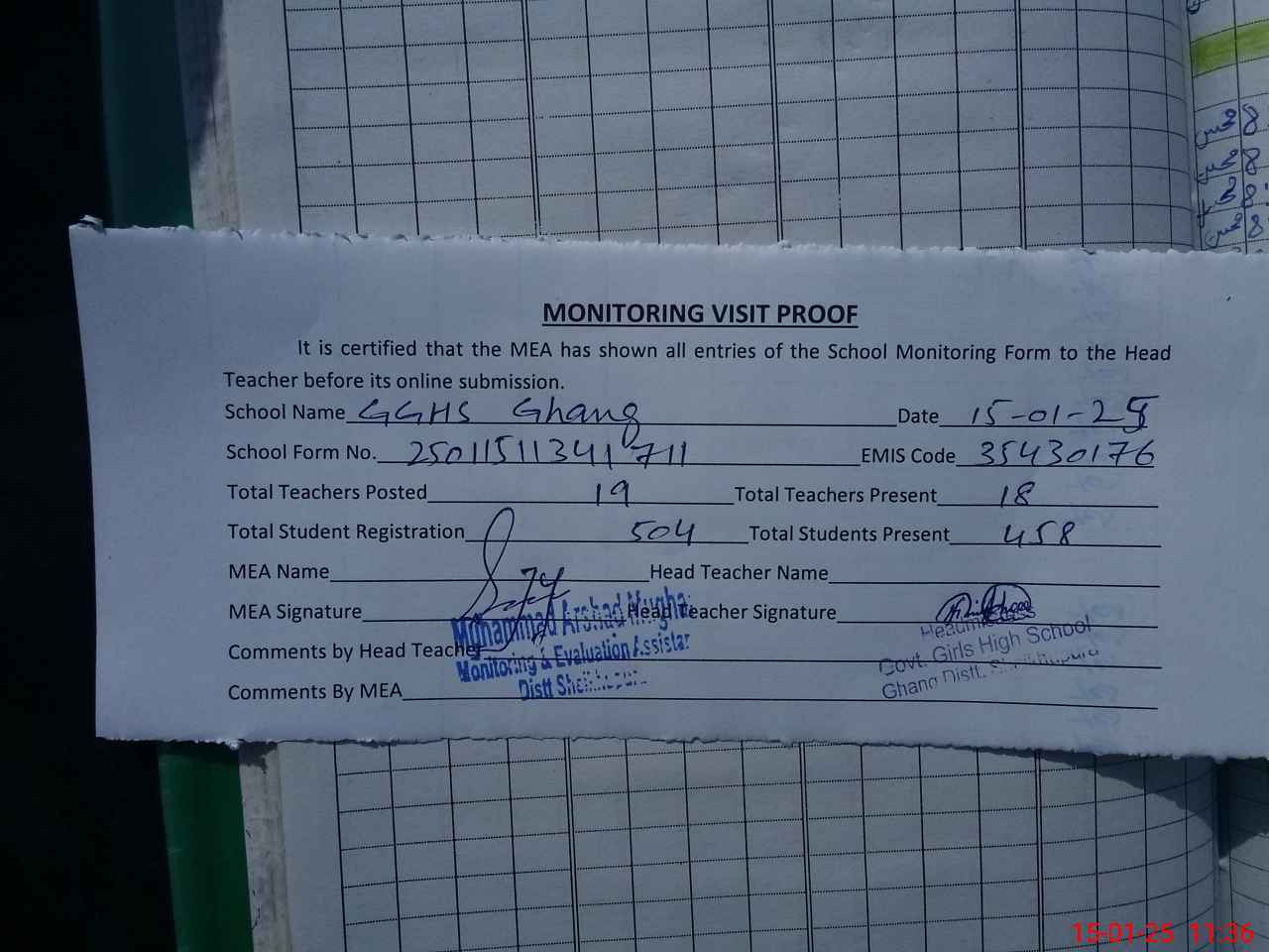 | Attendance Register | Head Teacher | MEA with School | Visit Proof |