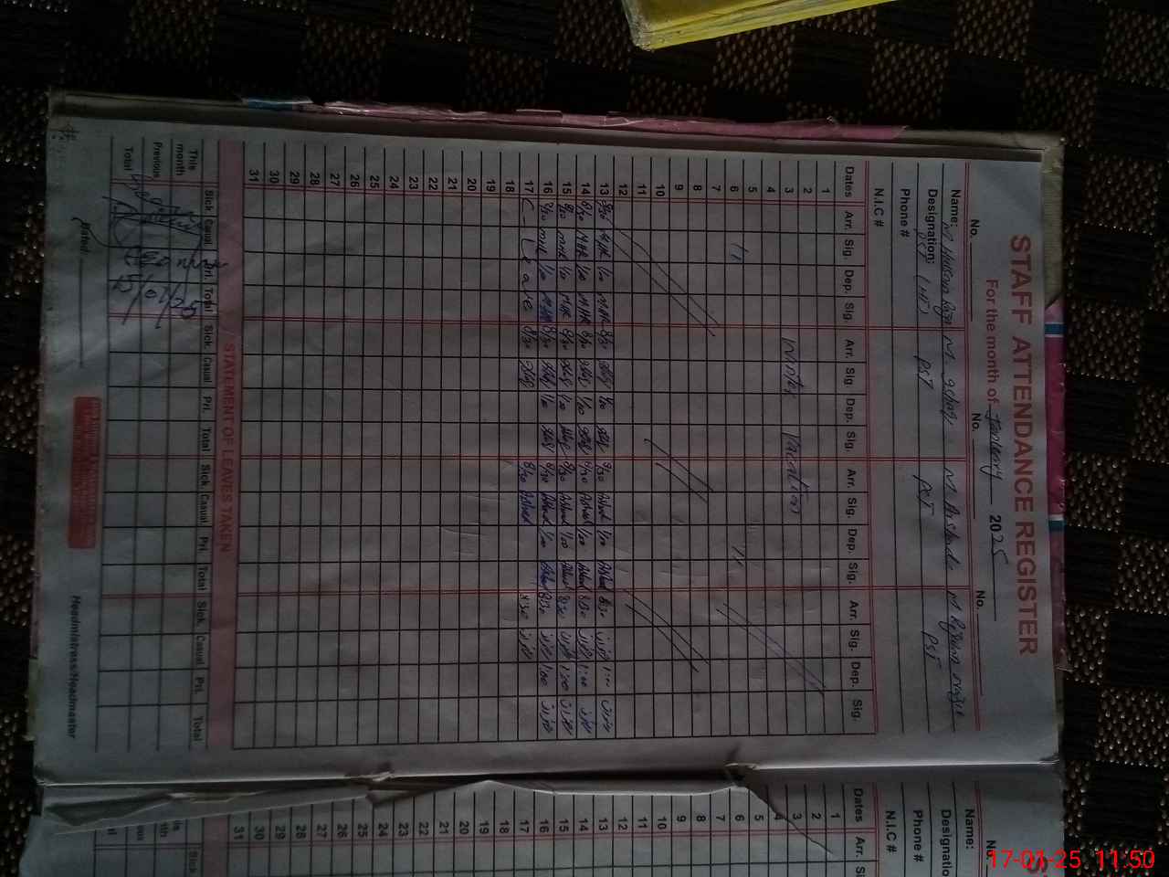 | CNIC | Full Name | Designation | R/C | Absence During Last Calender Month |