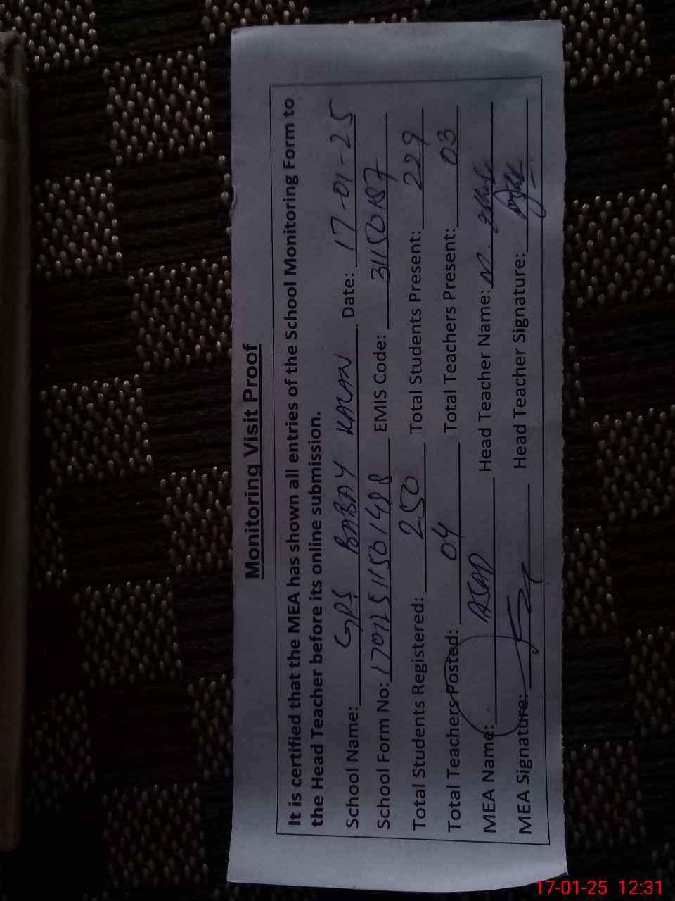 | Attendance Register | Head Teacher | MEA with School | Visit Proof |
