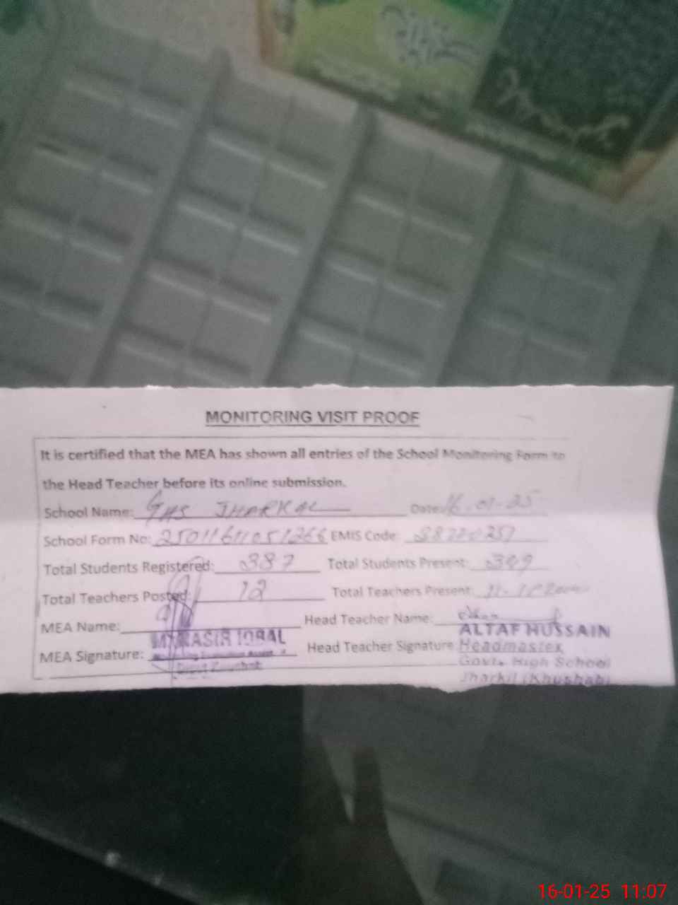 | Attendance Register | Head Teacher | MEA with School | Visit Proof |