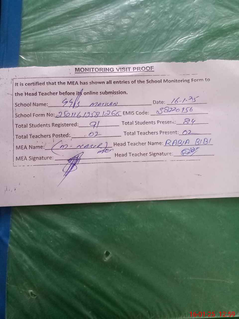| Certified that this School was Inspected by the Undersigned MEA/DMO Today and the Information Stated Above is as Per Record. | |||||