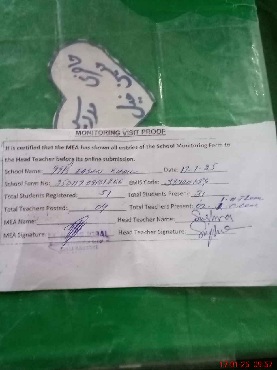 | Attendance Register | Head Teacher | MEA with School | Visit Proof |