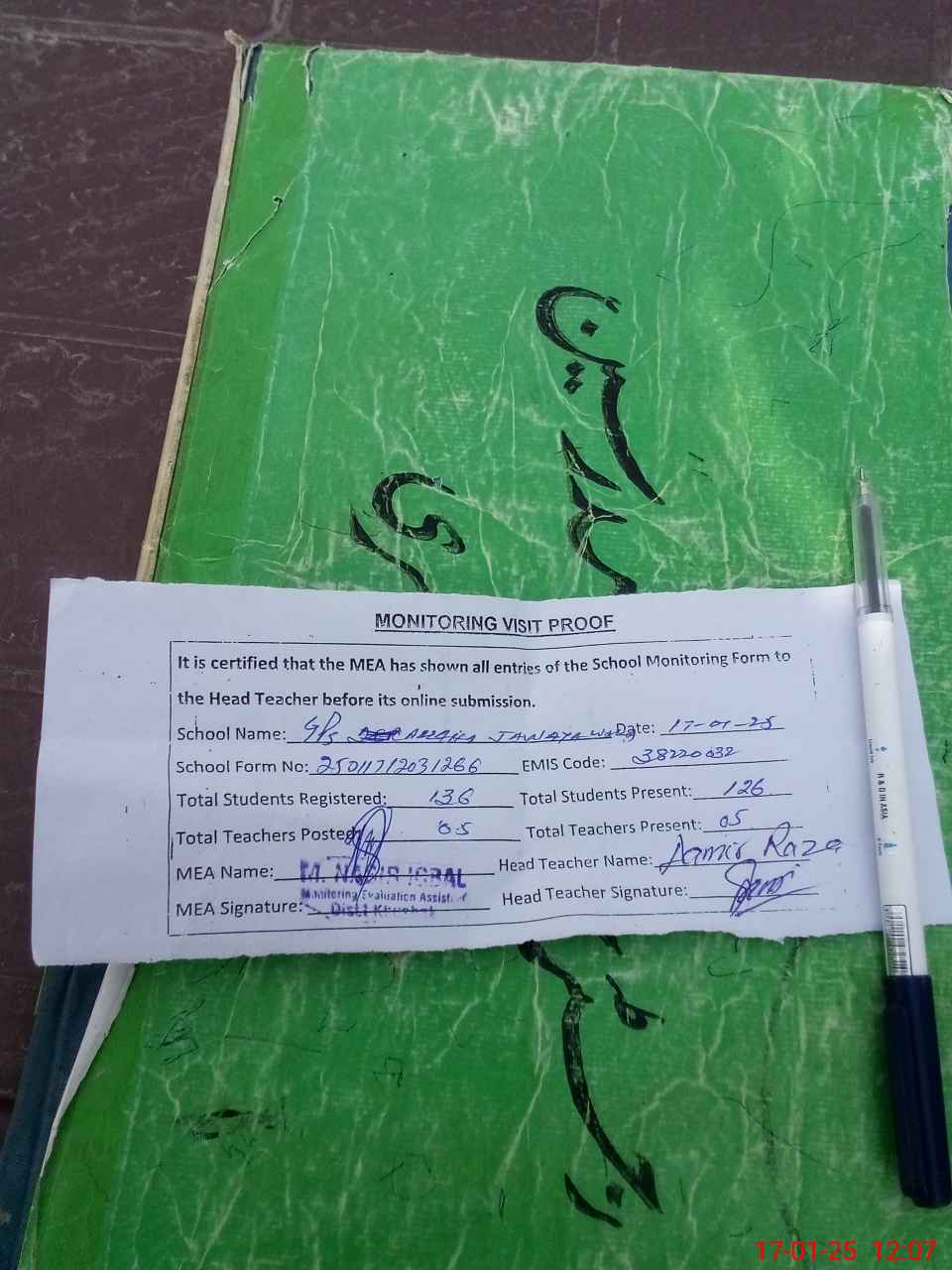 | Attendance Register | Head Teacher | MEA with School | Visit Proof |