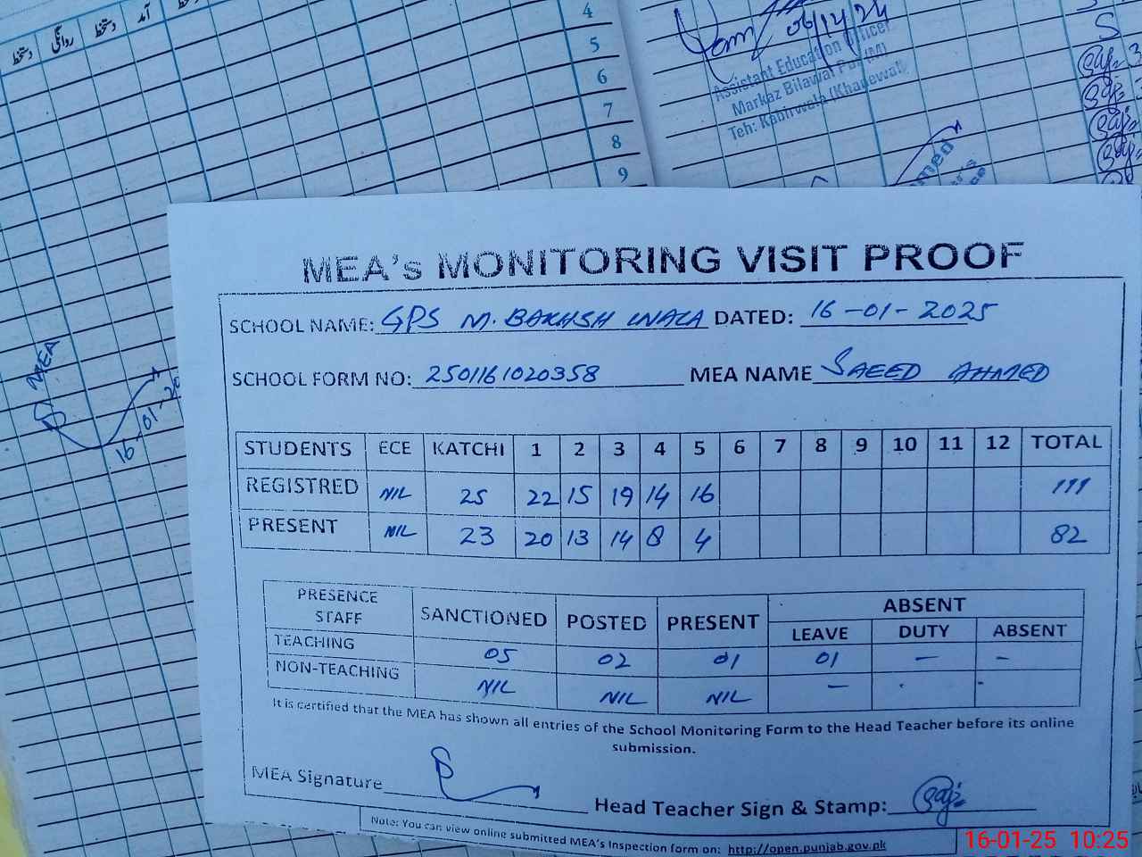 | Attendance Register | Head Teacher | MEA with School | Visit Proof |