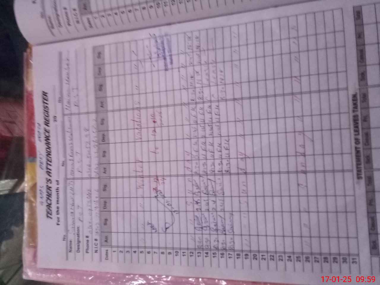 | CNIC | Full Name | Designation | R/C | Absence during last cal. month |