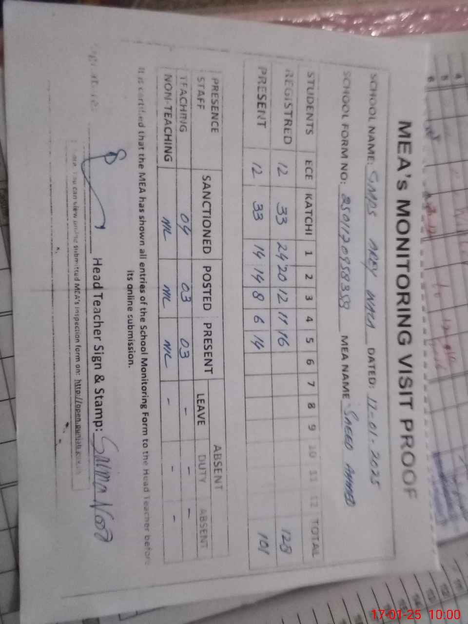 | Attendance Register | Head Teacher | MEA with School | Visit Proof |