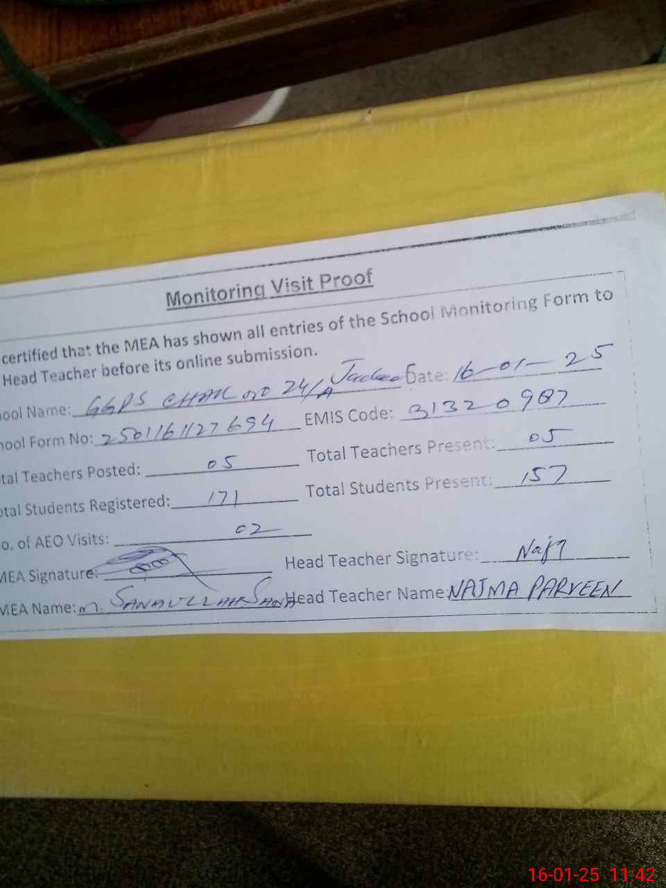 | Attendance Register | Head Teacher | MEA with School | Visit Proof |