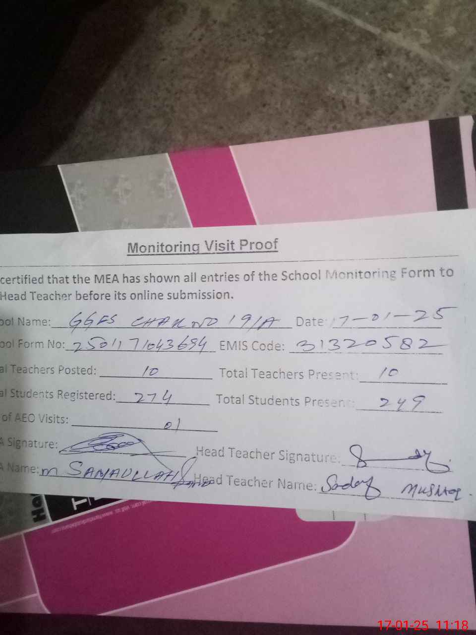 | Attendance Register | Head Teacher | MEA with School | Visit Proof |