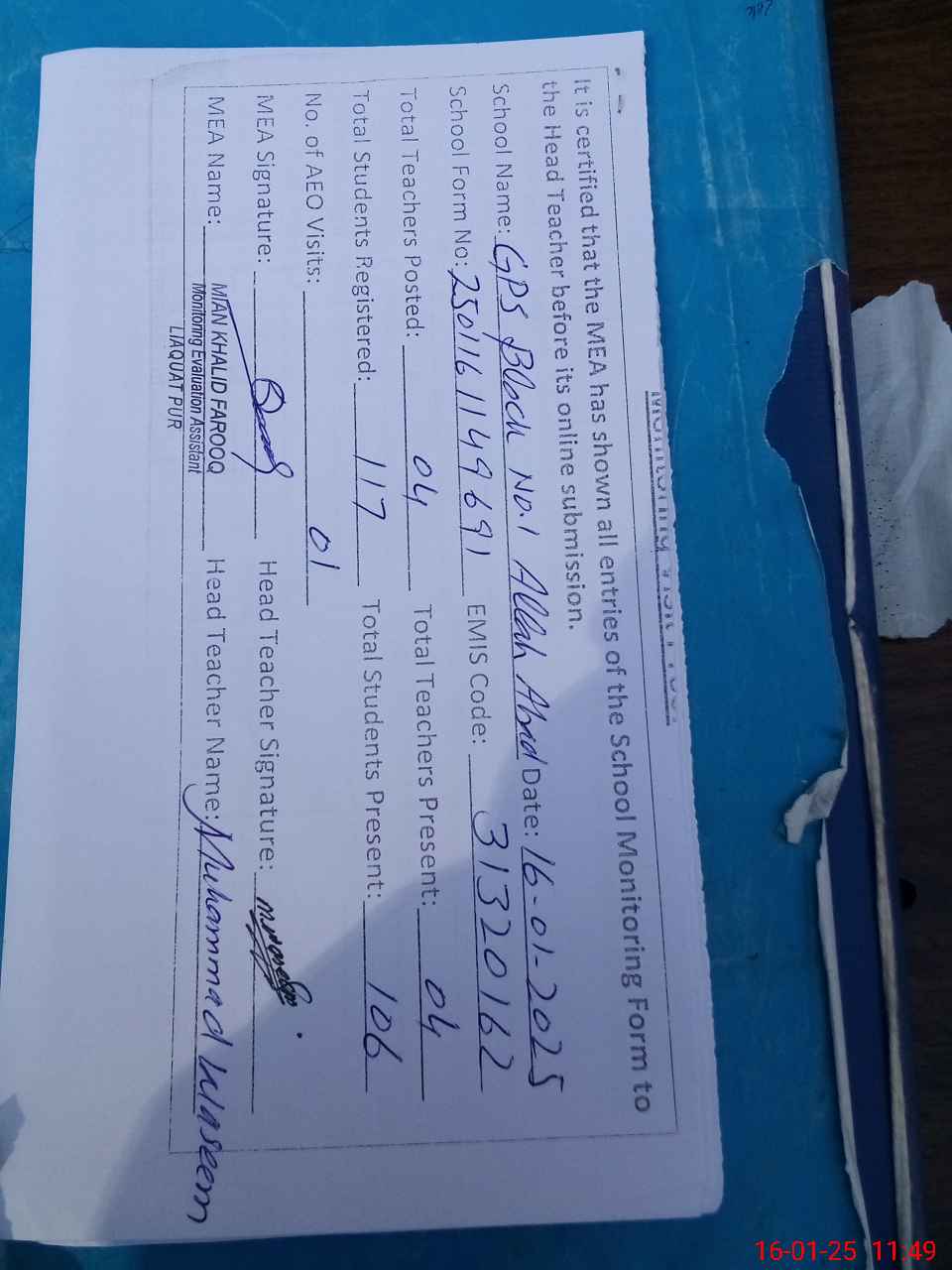| Attendance Register | Head Teacher | MEA with School | Visit Proof |