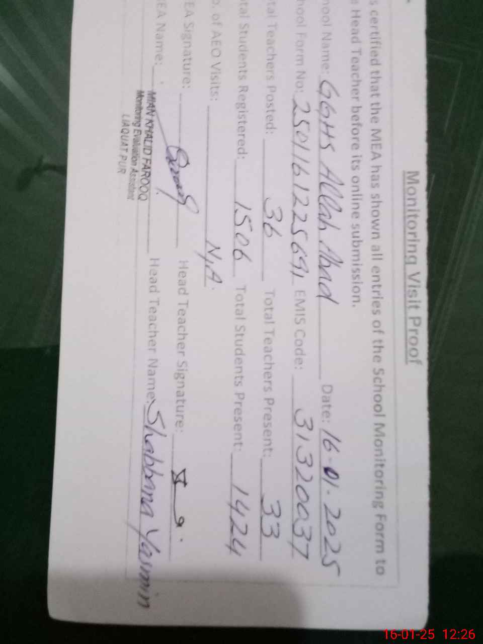 | Attendance Register | Head Teacher | MEA with School | Visit Proof |