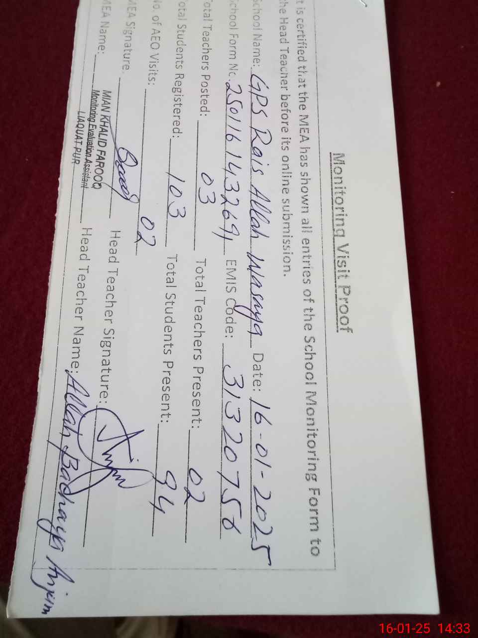 | Attendance Register | Head Teacher | MEA with School | Visit Proof |