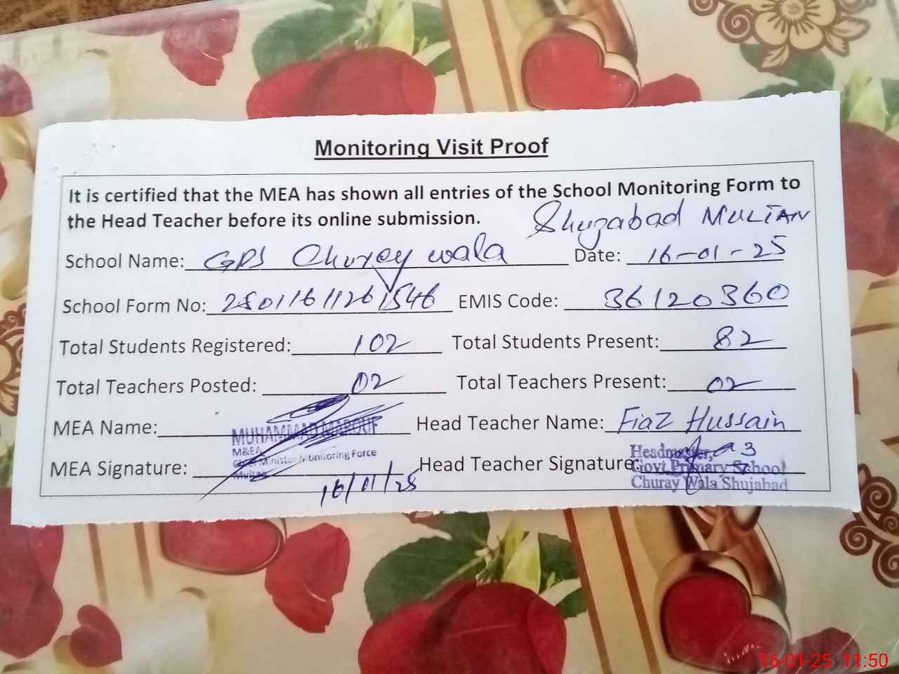 | Attendance Register | Head Teacher | MEA with School | Visit Proof |