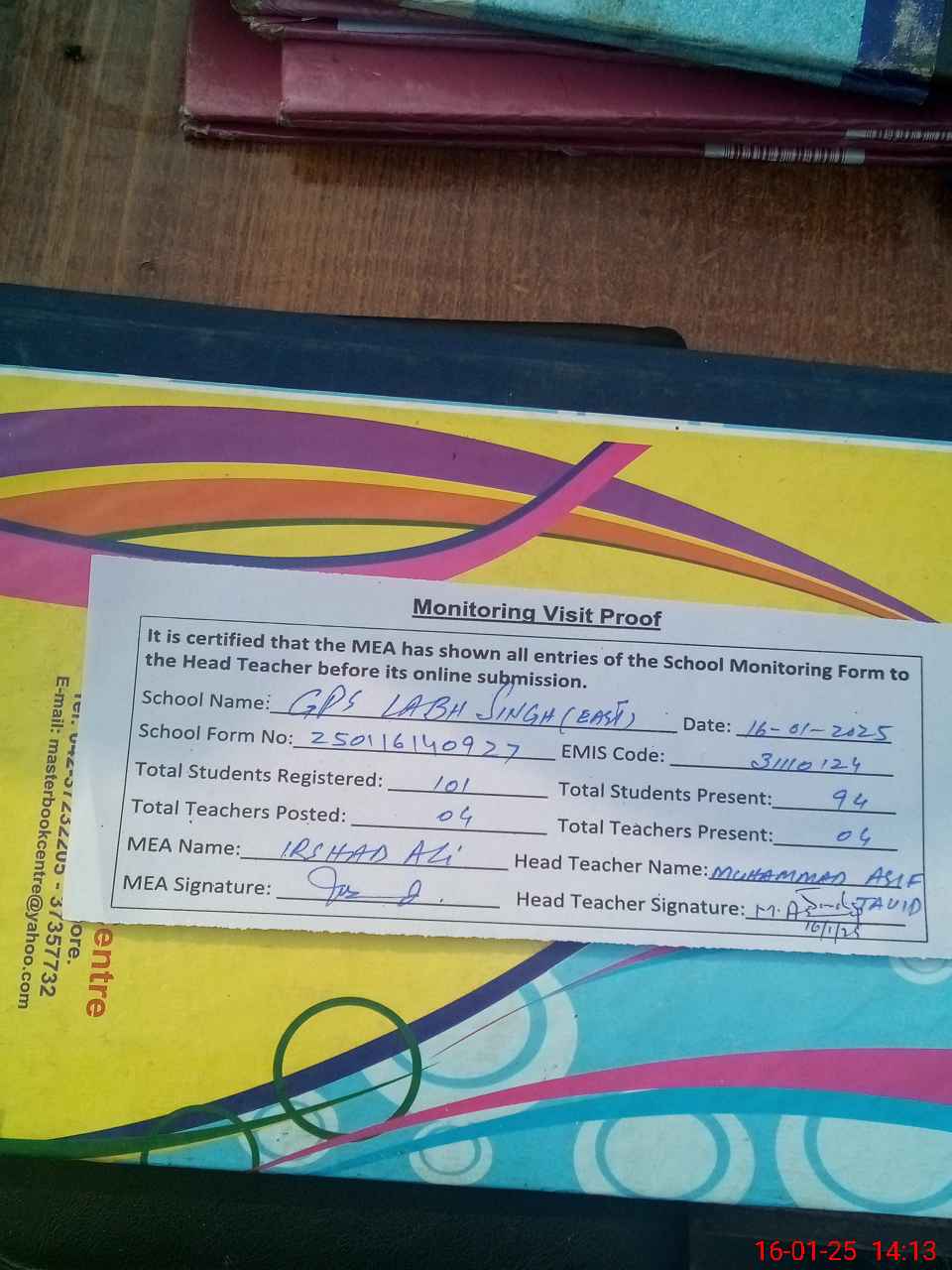 | Attendance Register | Head Teacher | MEA with School | Visit Proof |
