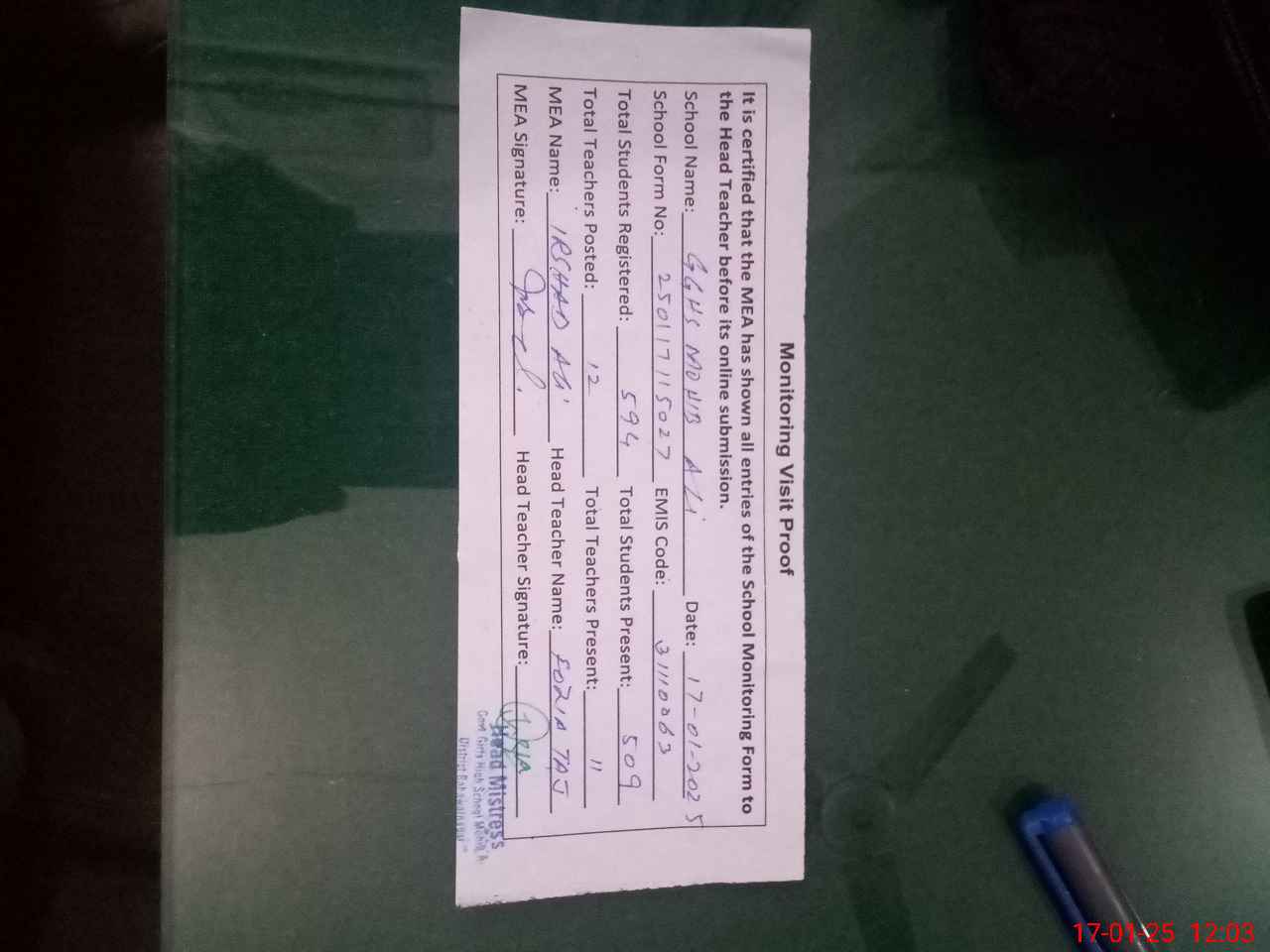 | Attendance Register | Head Teacher | MEA with School | Visit Proof |