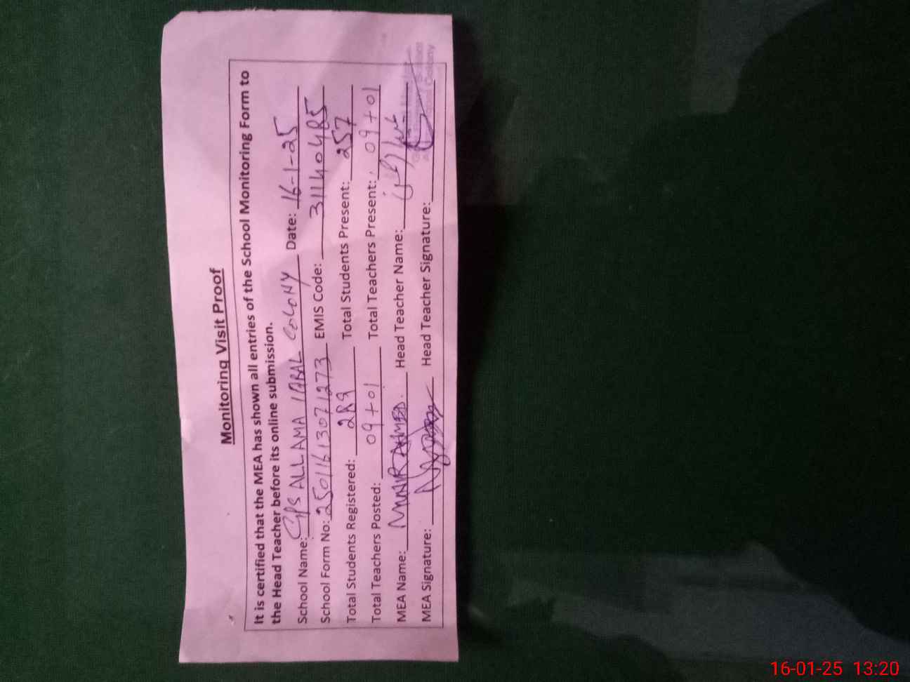 | Attendance Register | Head Teacher | MEA with School | Visit Proof |