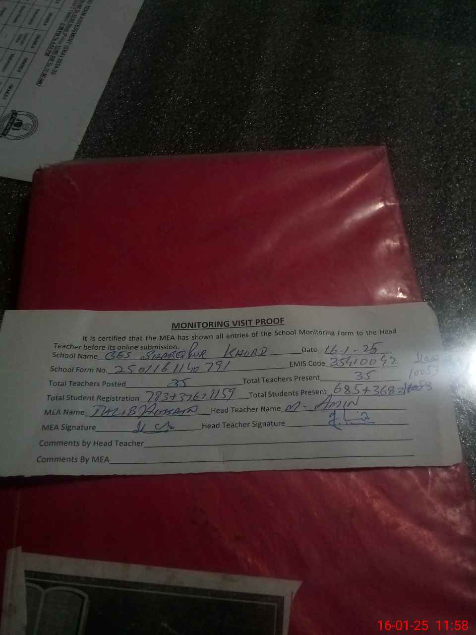 | Attendance Register | Head Teacher | MEA with School | Visit Proof |