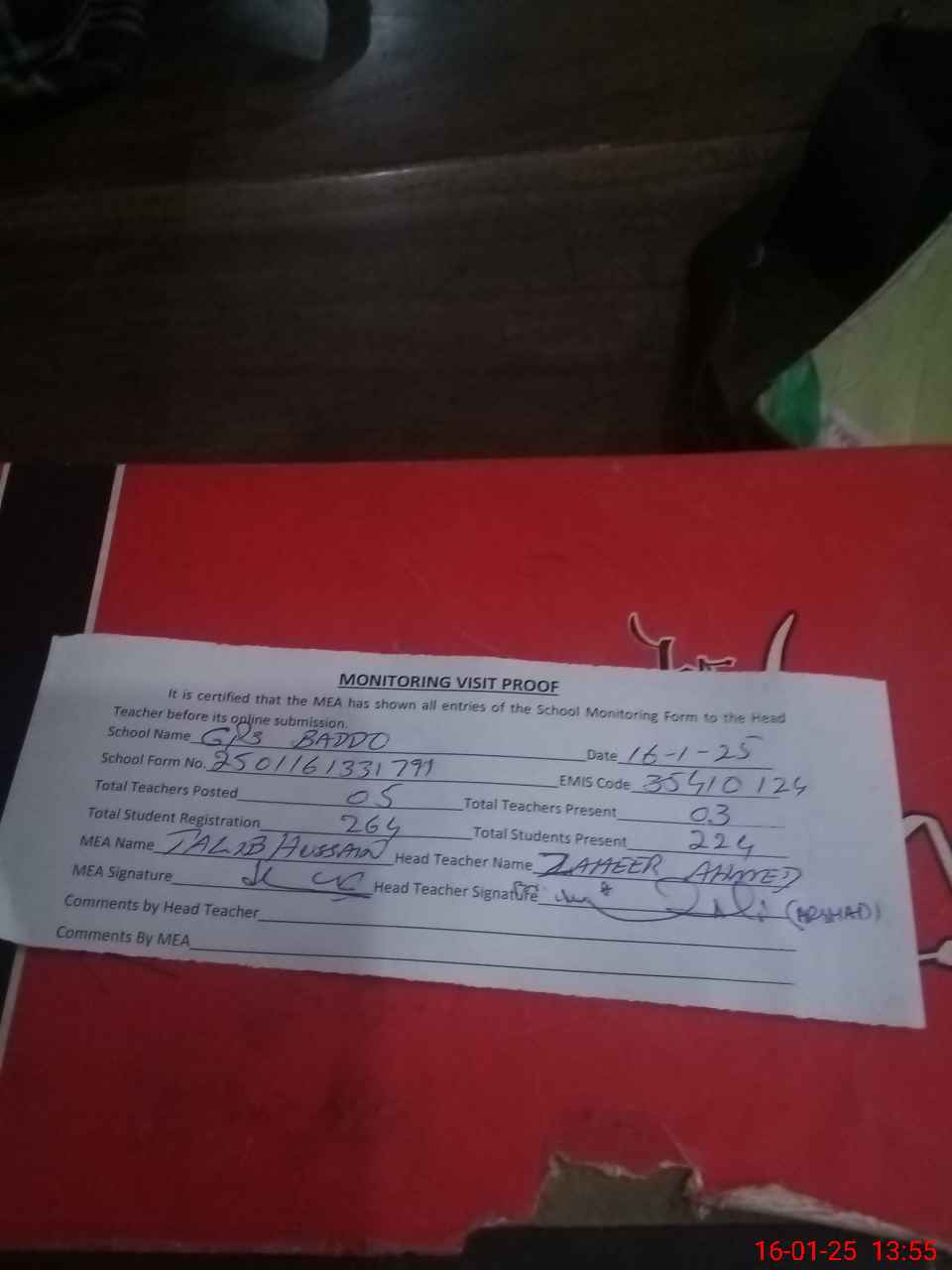 | Attendance Register | Head Teacher | MEA with School | Visit Proof |