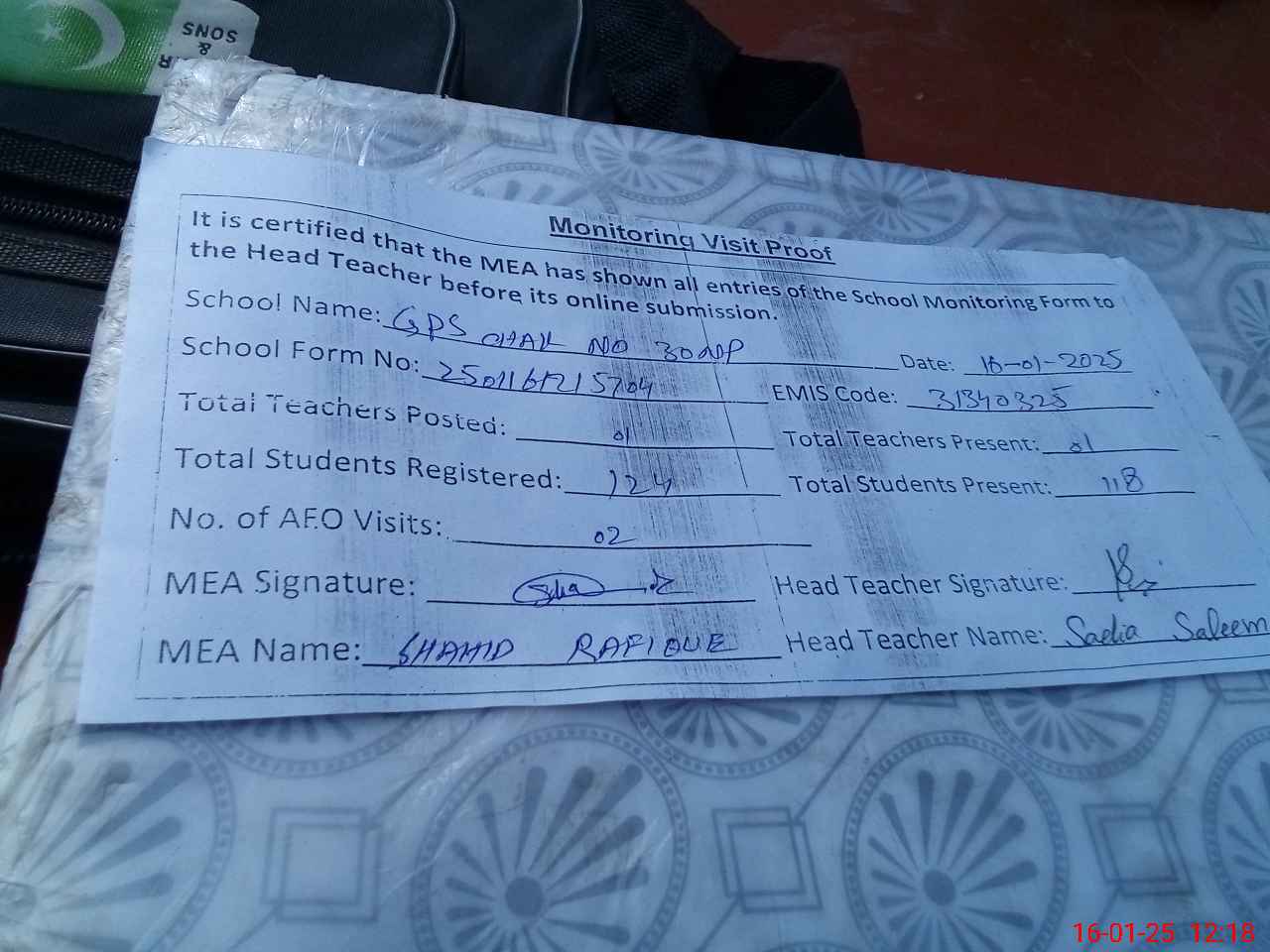 | Attendance Register | Head Teacher | MEA with School | Visit Proof |