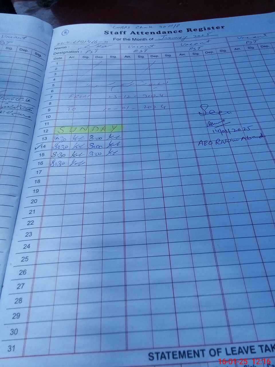 | CNIC | Full Name | Designation | R/C | Absence During Last Calender Month |