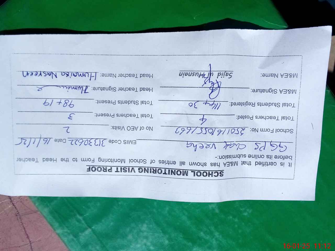 | Attendance Register | Head Teacher | MEA with School | Visit Proof |