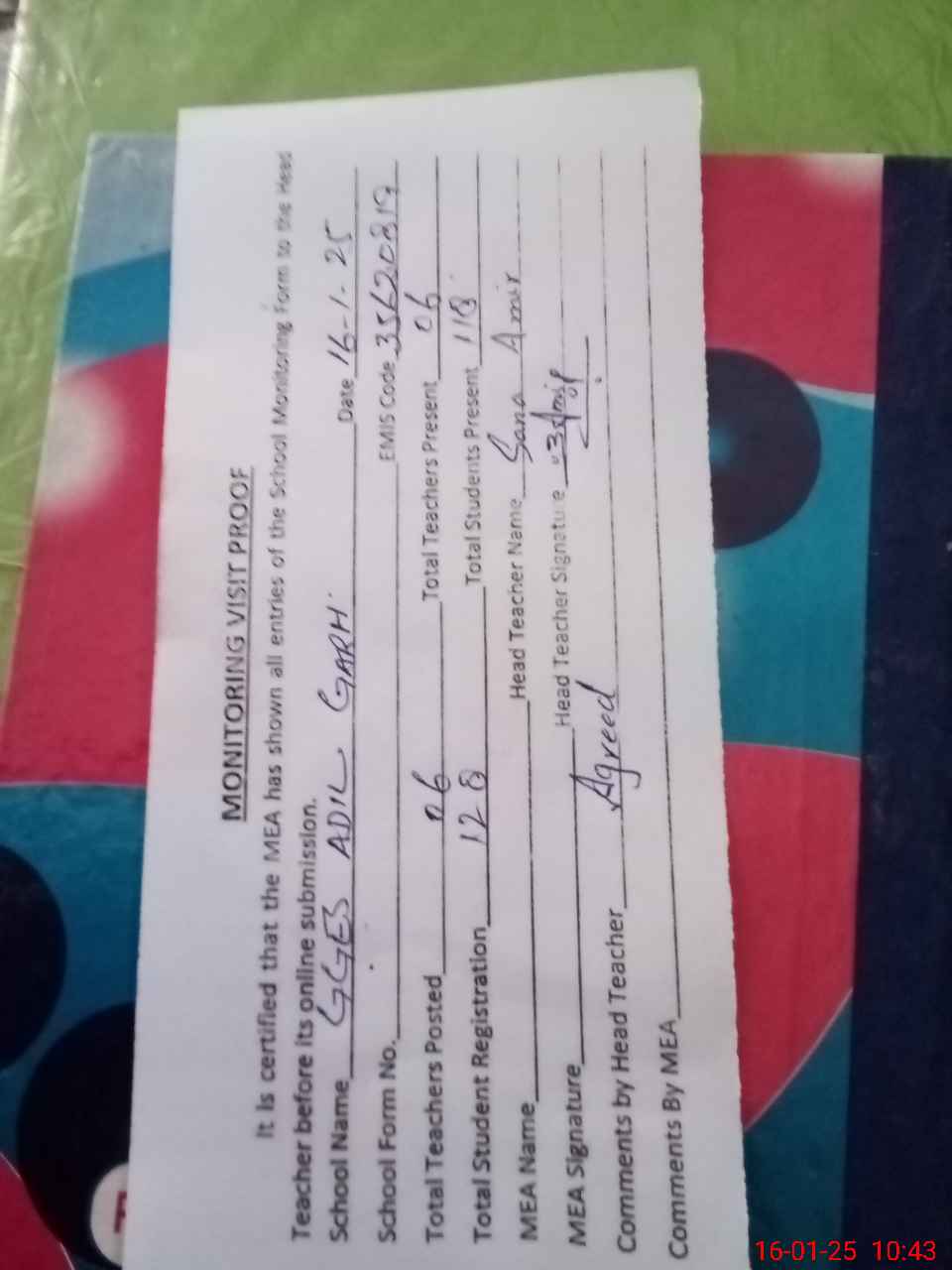 | Attendance Register | Head Teacher | MEA with School | Visit Proof |
