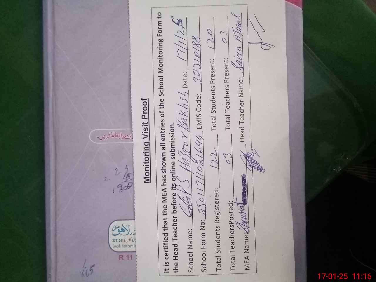 | Attendance Register | Head Teacher | MEA with School | Visit Proof |