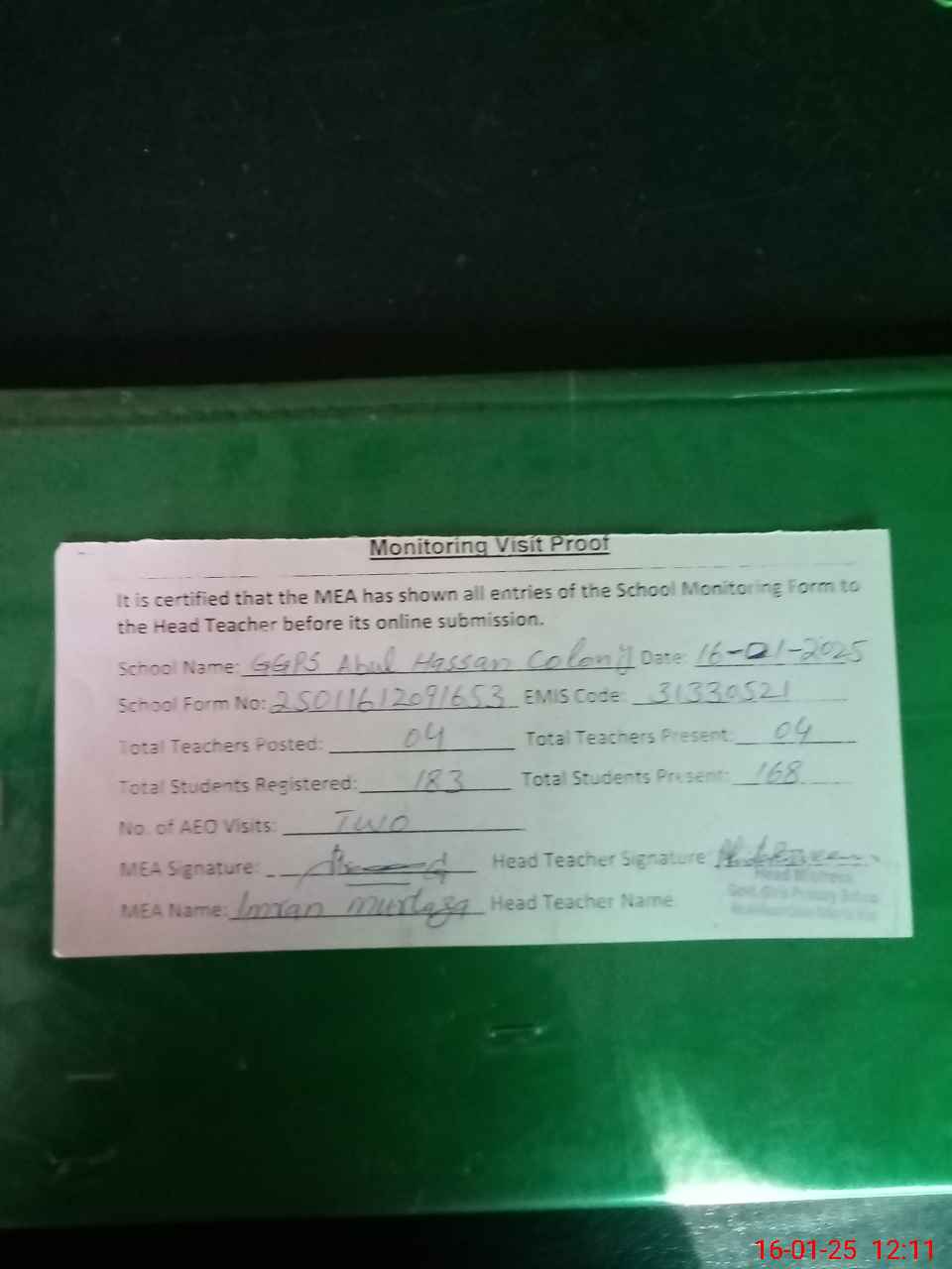 | Attendance Register | Head Teacher | MEA with School | Visit Proof |