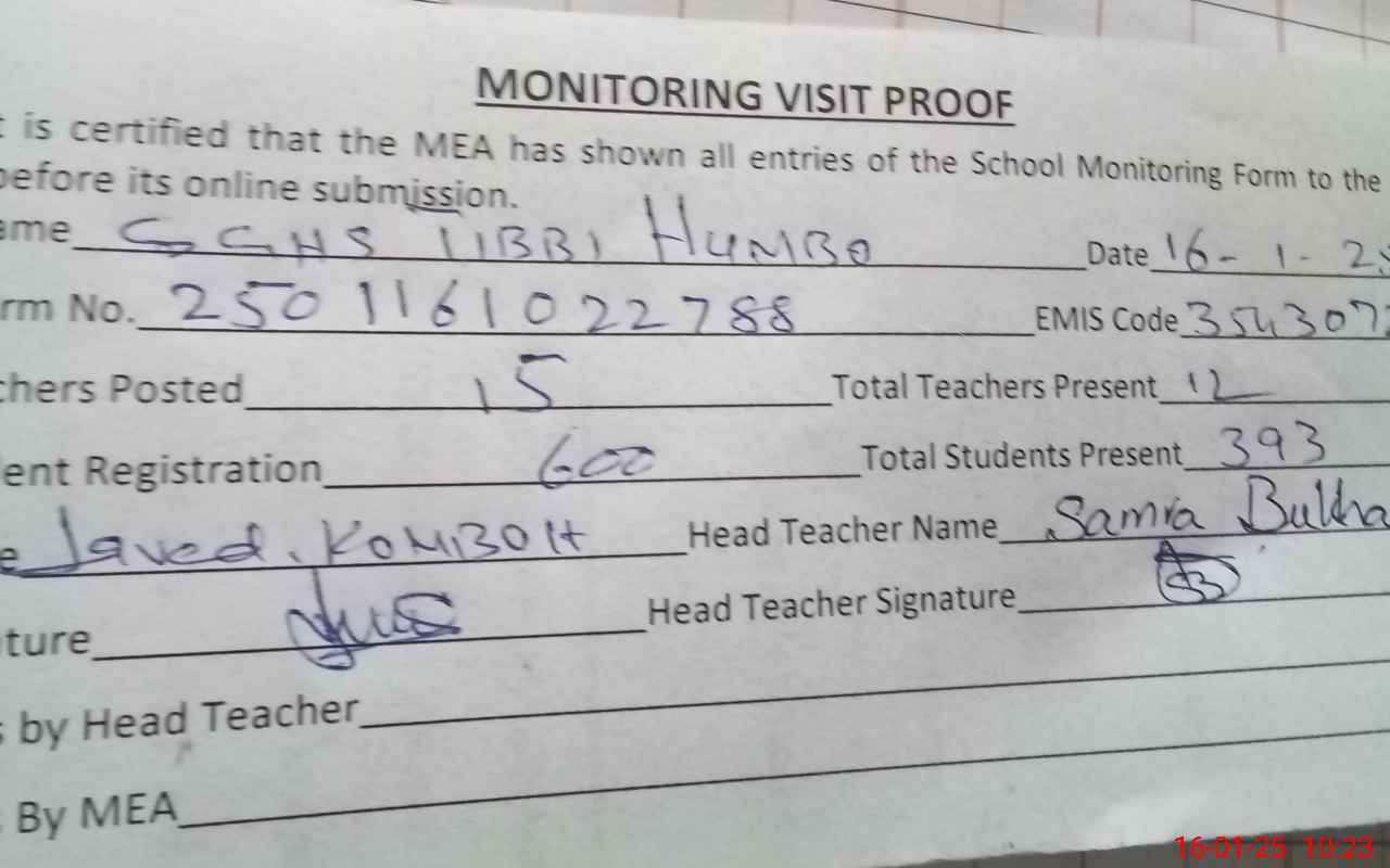| Attendance Register | Head Teacher | MEA with School | Visit Proof |