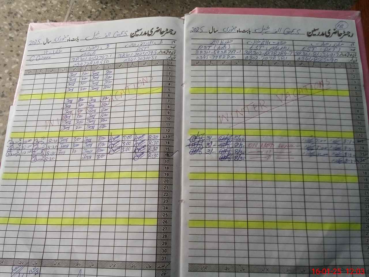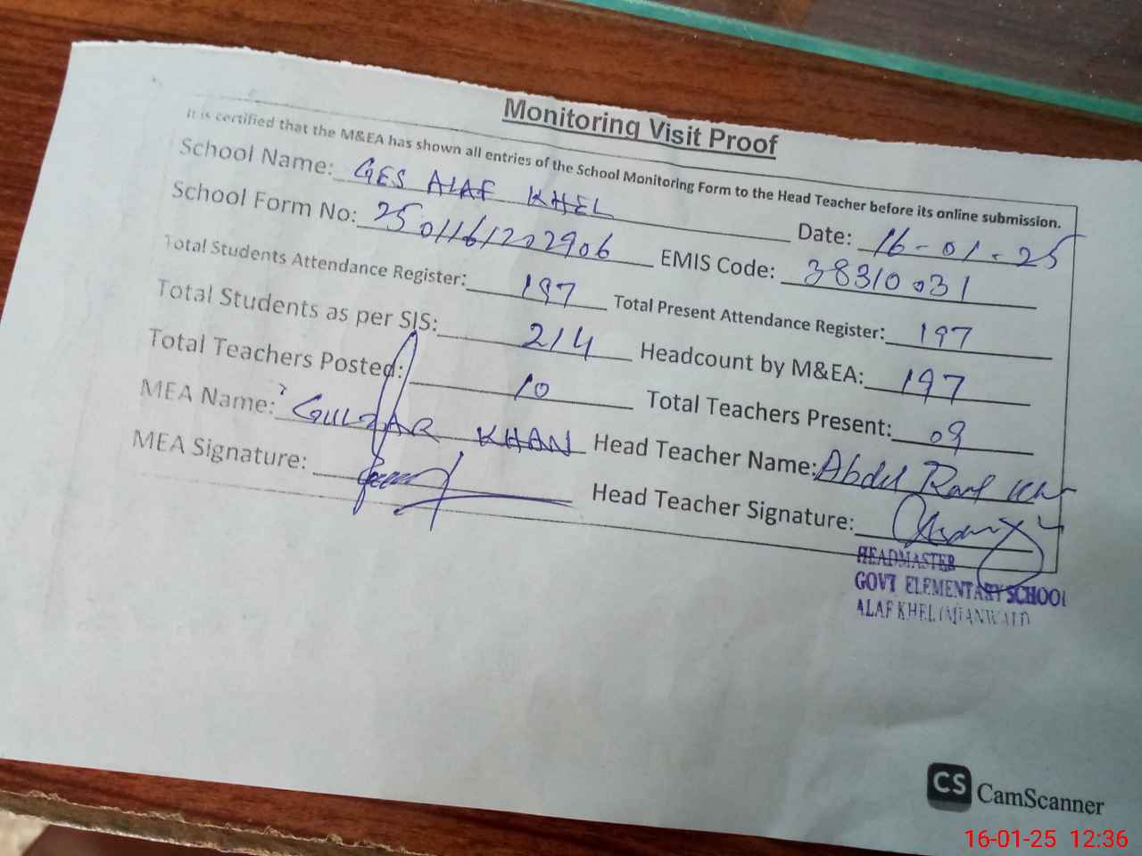 | Total no. of Classrooms: 9 No. of Classrooms Used for Teaching: 9 No. of Classrooms Storing Old Furniture, FTBs, etc: 0Comments if Any: EST Inayatullah Khan absent due to leave not approved on SIS and no any other documents available in the school as per mark attendance as medical leave |