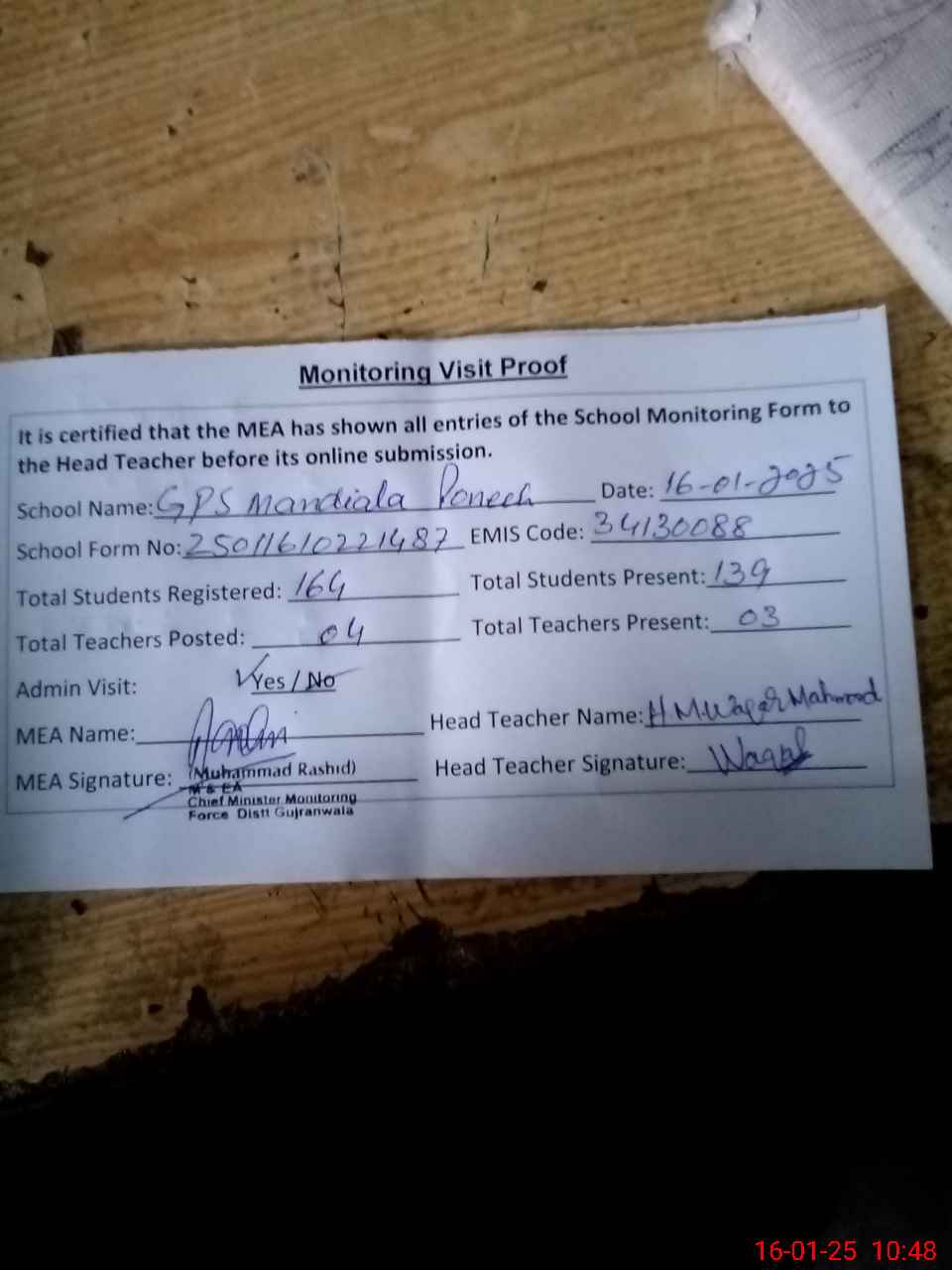 | Attendance Register | Head Teacher | MEA with School | Visit Proof |