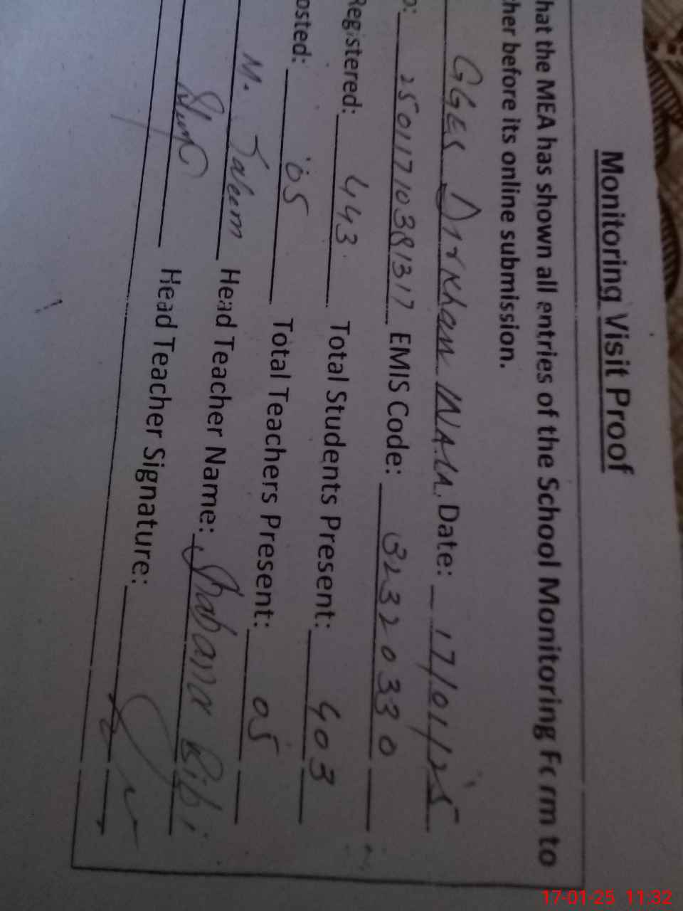 | Attendance Register | Head Teacher | MEA with School | Visit Proof |