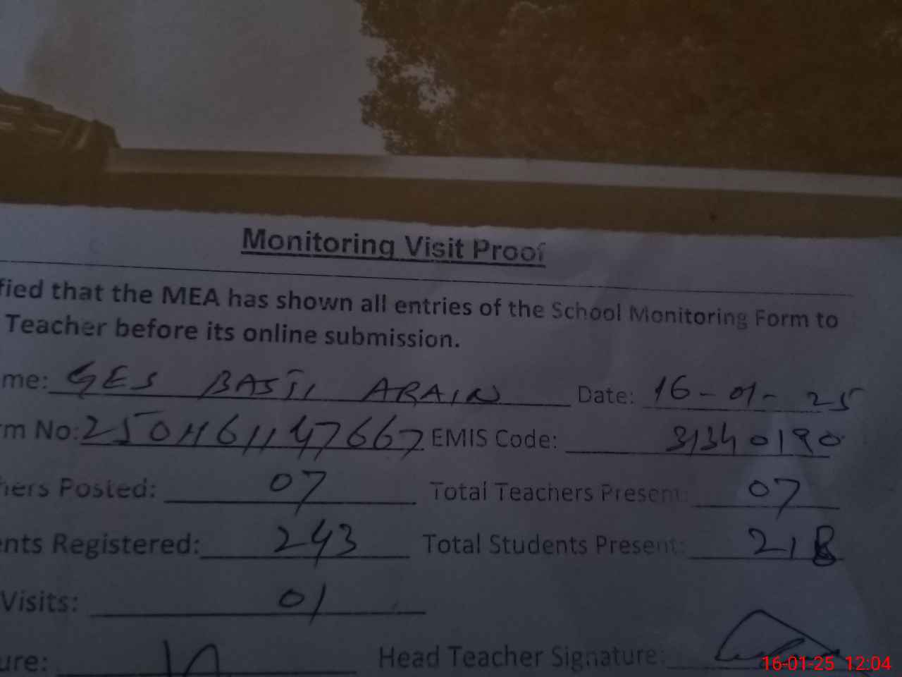 | Attendance Register | Head Teacher | MEA with School | Visit Proof |