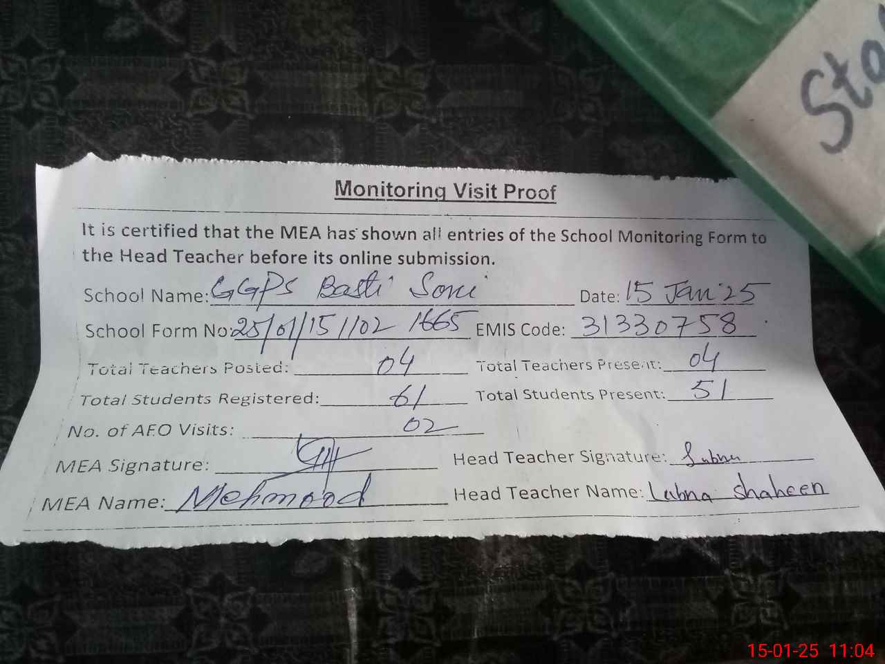 | Attendance Register | Head Teacher | MEA with School | Visit Proof |