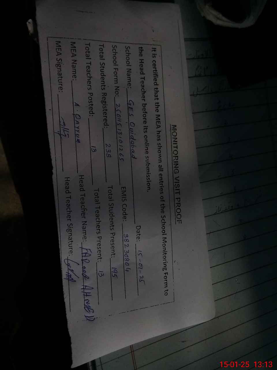 | Certified that this School was Inspected by the Undersigned MEA/DMO Today and the Information Stated Above is as Per Record. | |||||