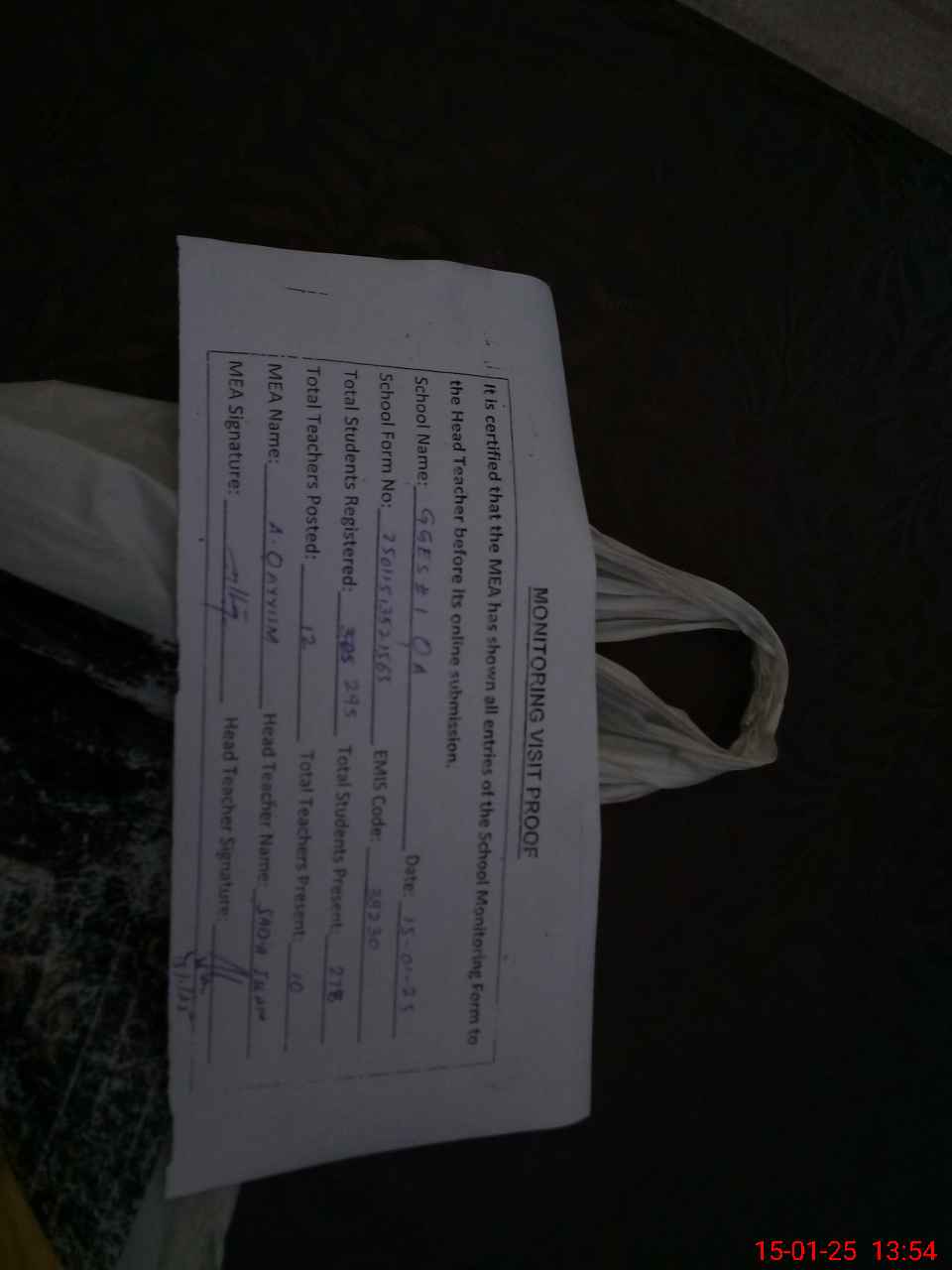 | Attendance Register | Head Teacher | MEA with School | Visit Proof |