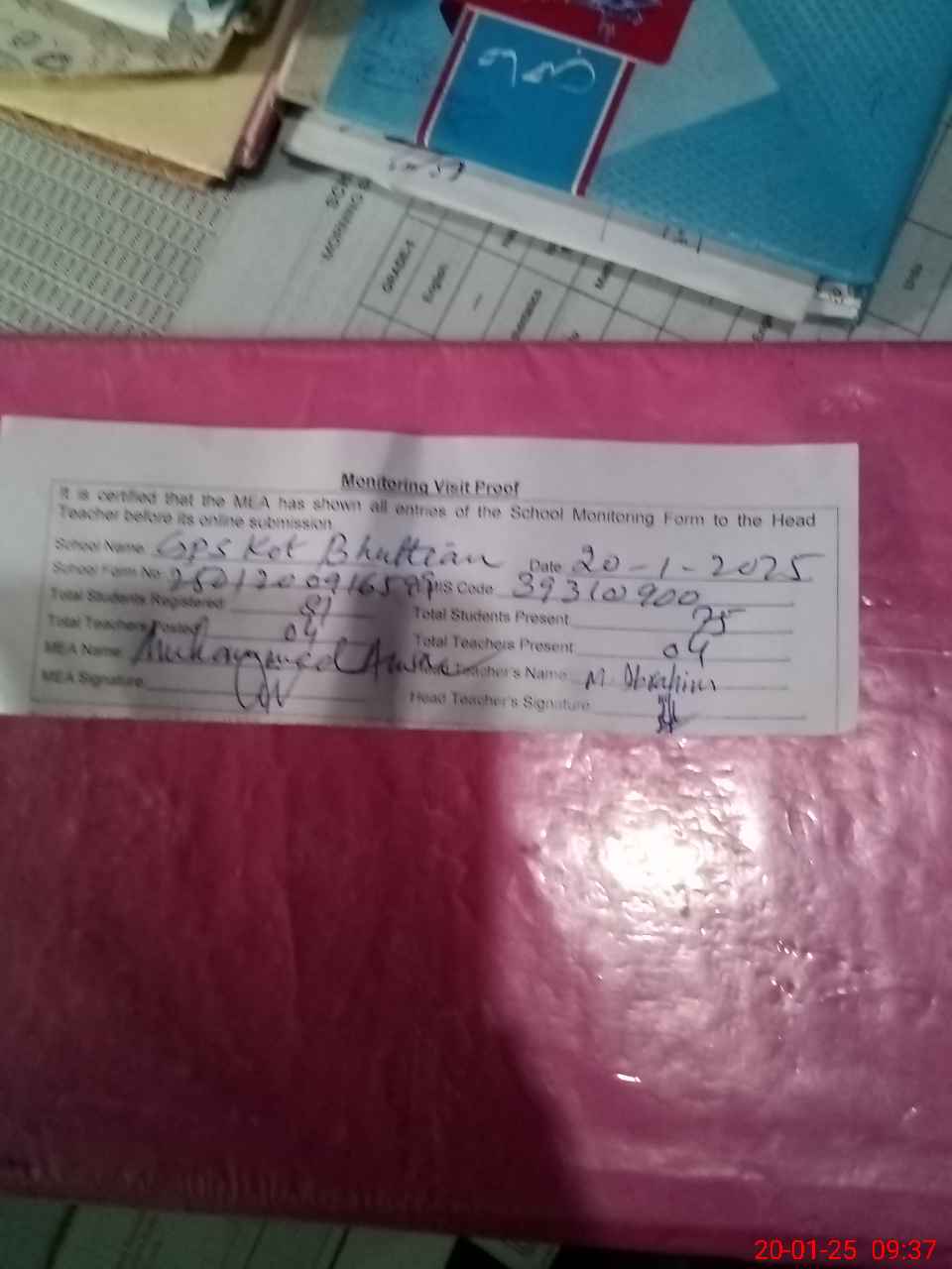 | Attendance Register | Head Teacher | MEA with School | Visit Proof |