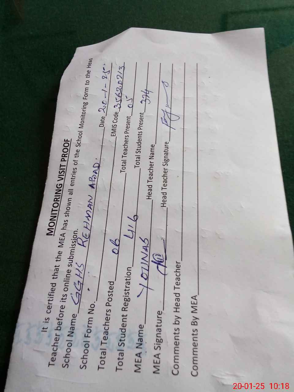 | Attendance Register | Head Teacher | MEA with School | Visit Proof |