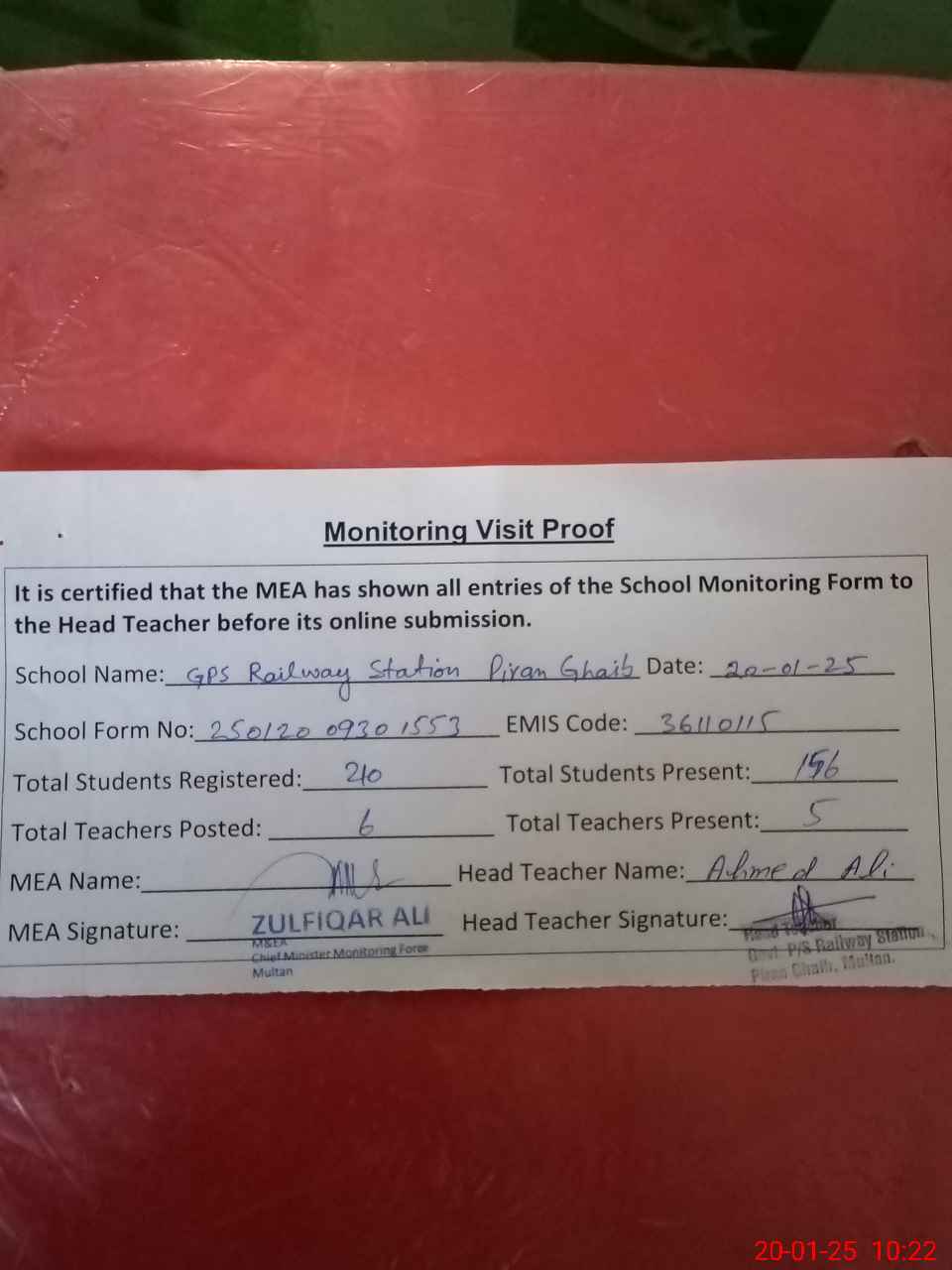 | Attendance Register | Head Teacher | MEA with School | Visit Proof |
