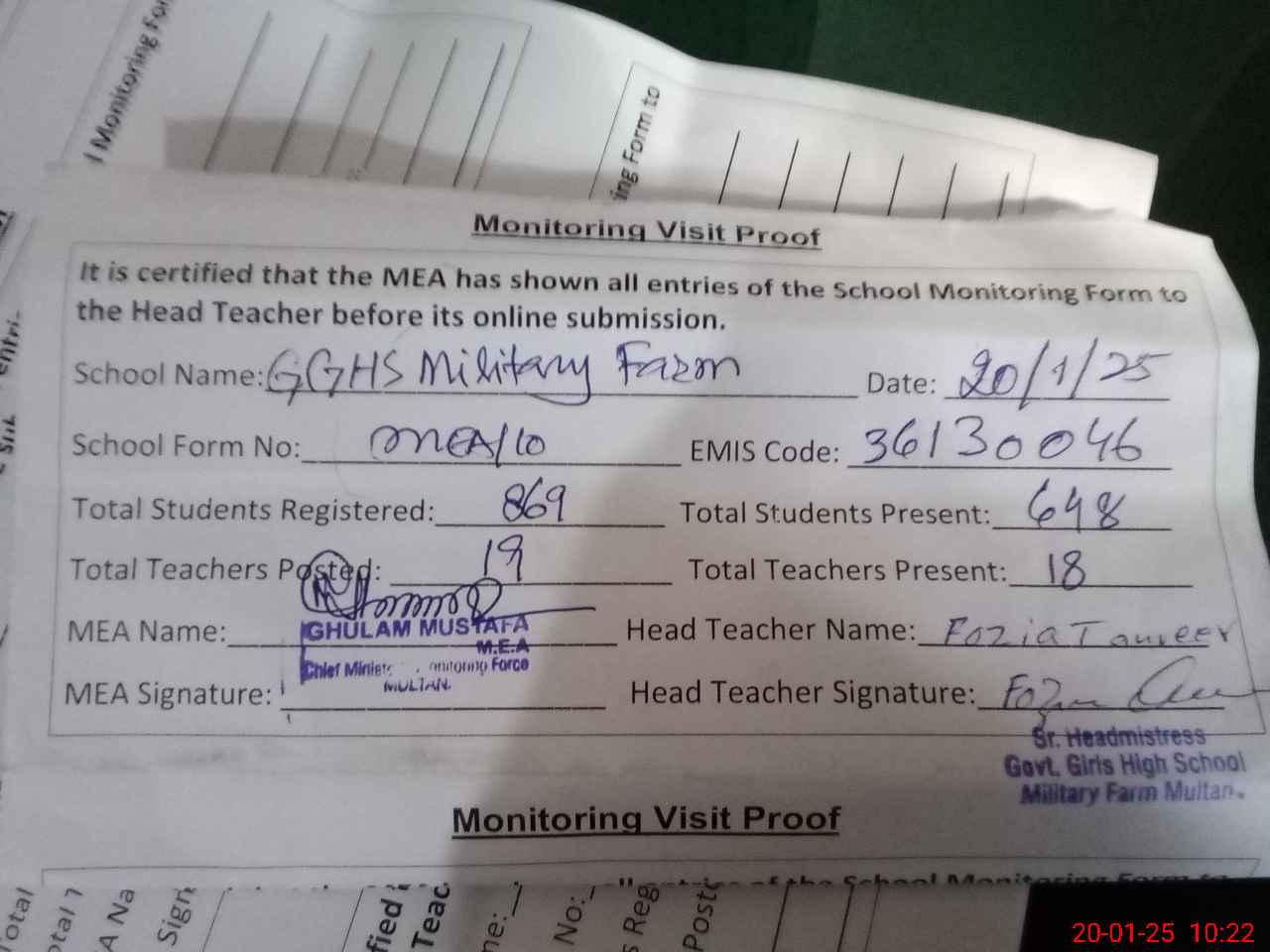 | Attendance Register | Head Teacher | MEA with School | Visit Proof |
