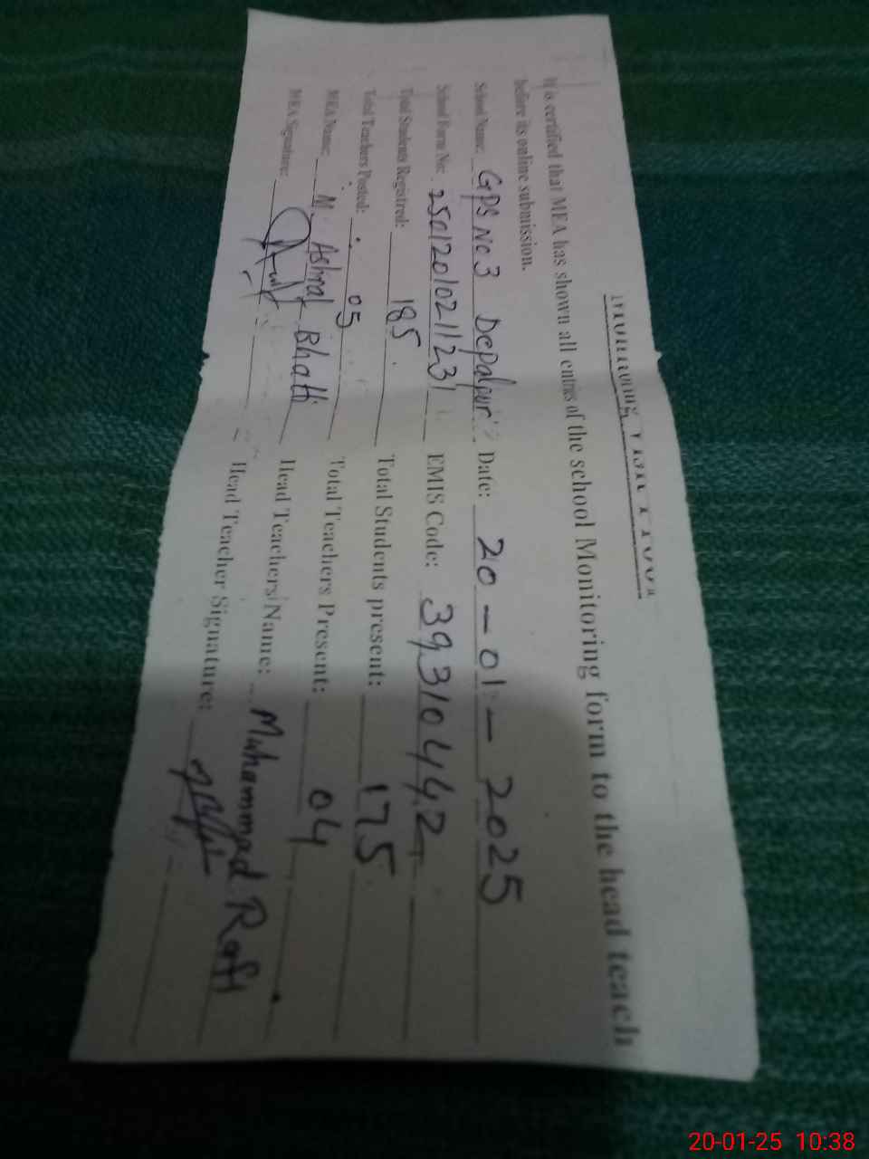 | Name: MU**** RA**** Designation: (School Headmaster's/Headmistress's) PST Phone/Cell Number: 03**** |