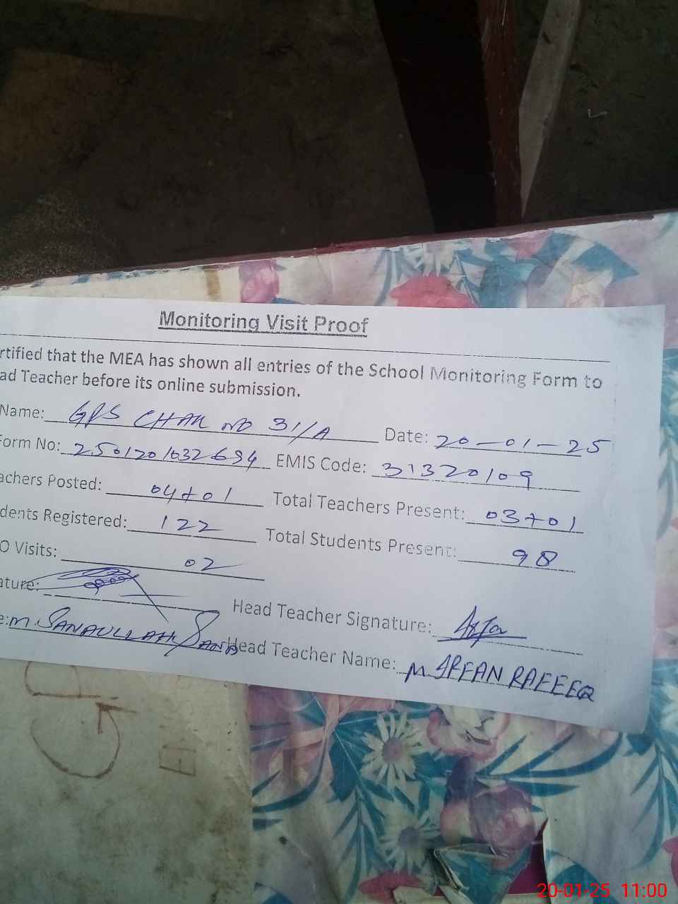 | Attendance Register | Head Teacher | MEA with School | Visit Proof |