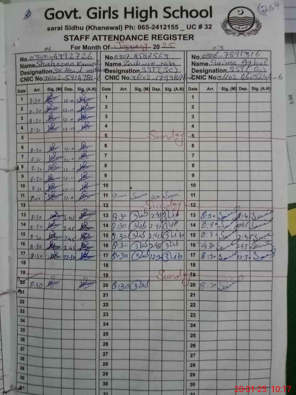 | CNIC | Full Name | Designation | R/C | Absence during last cal. month |