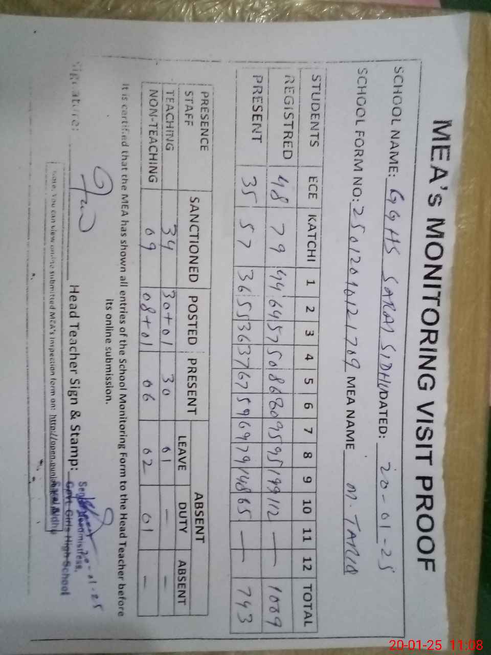 | Attendance Register | Head Teacher | MEA with School | Visit Proof |