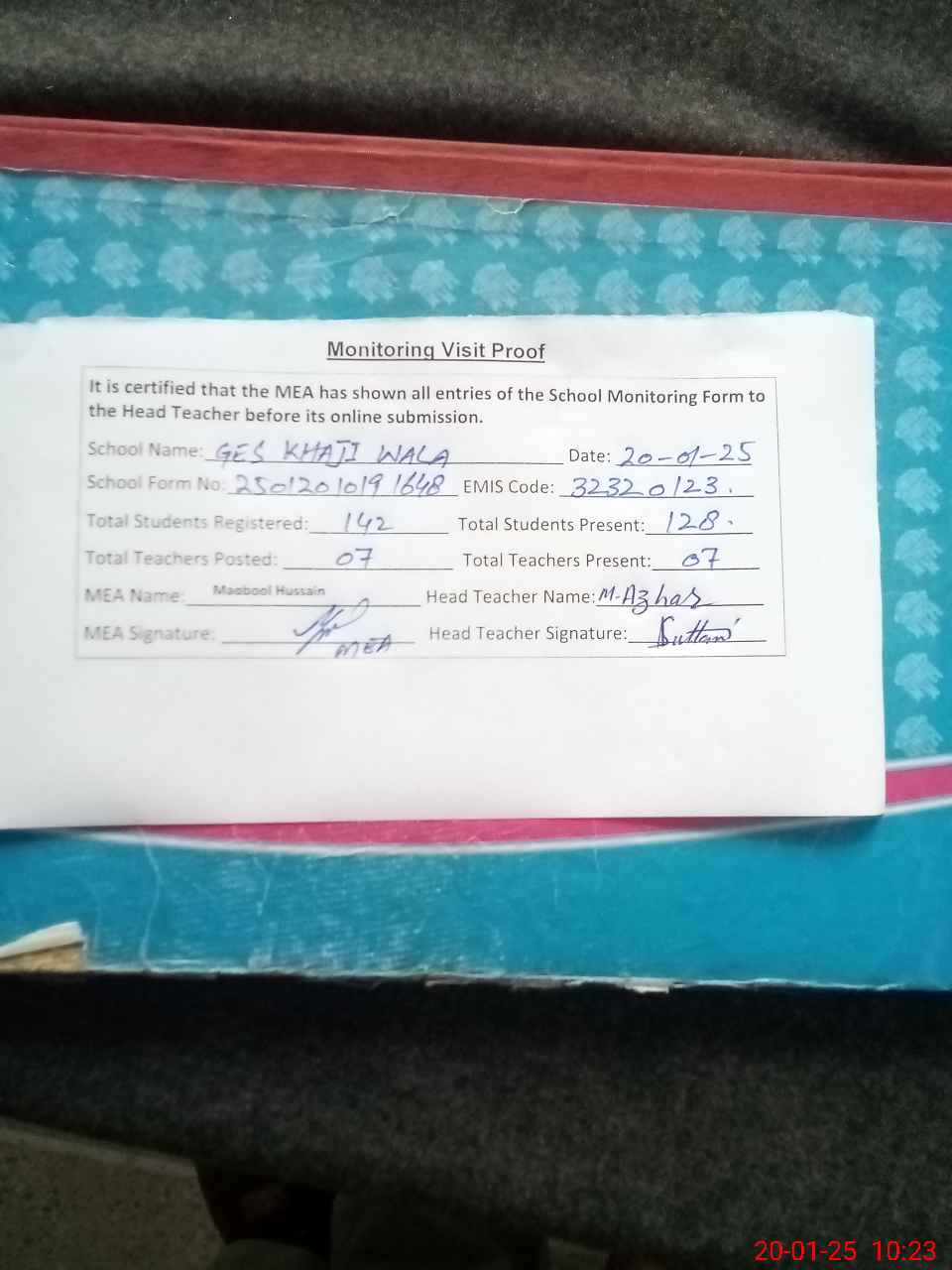 | Attendance Register | Head Teacher | MEA with School | Visit Proof |