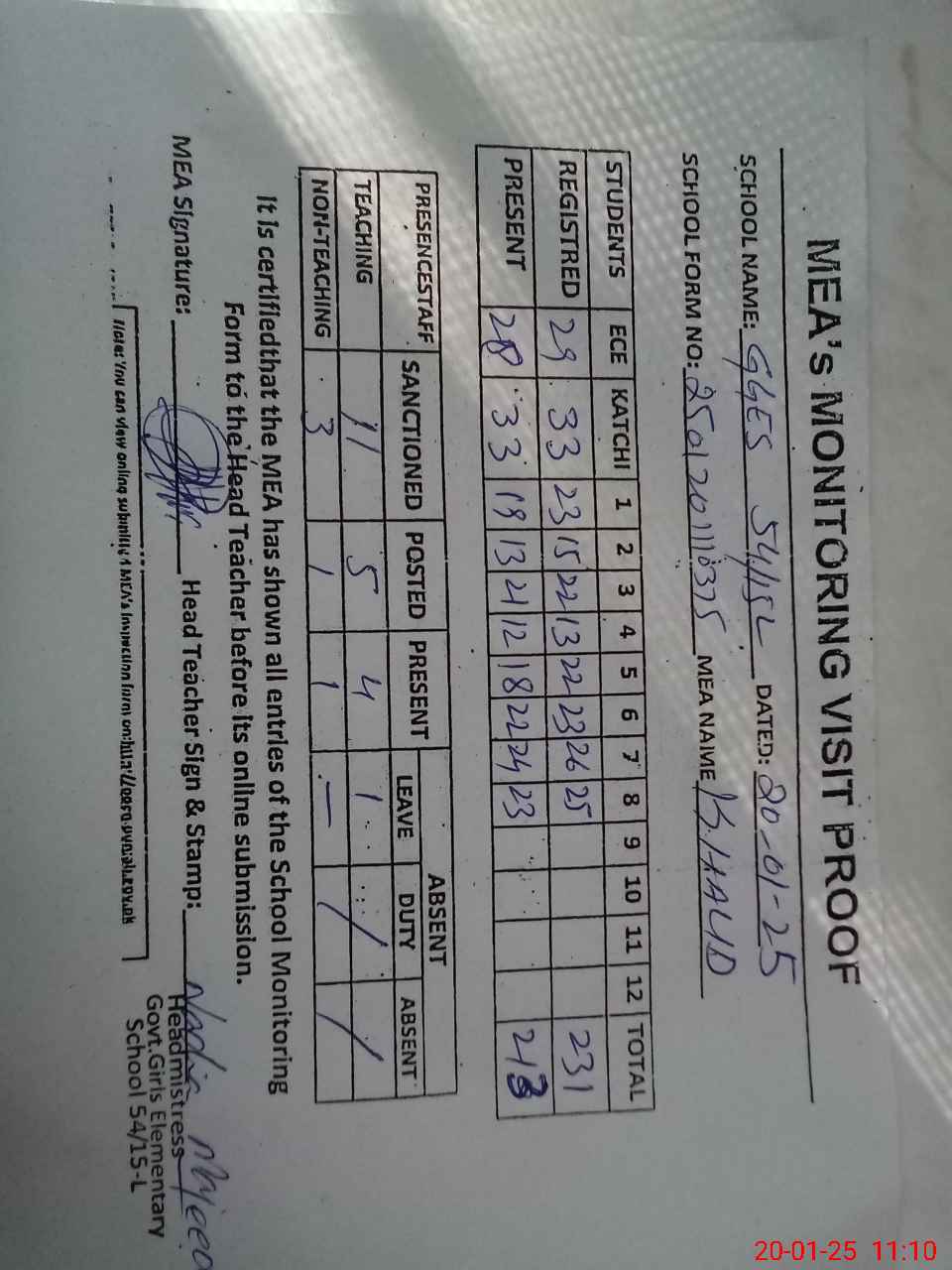 | Attendance Register | Head Teacher | MEA with School | Visit Proof |