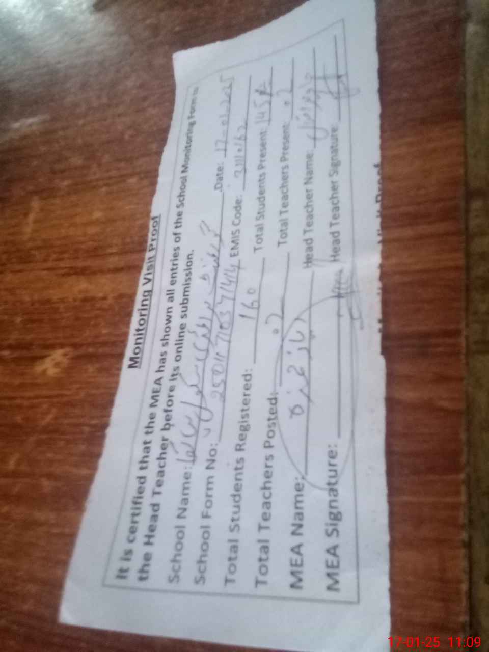 | Attendance Register | Head Teacher | MEA with School | Visit Proof |