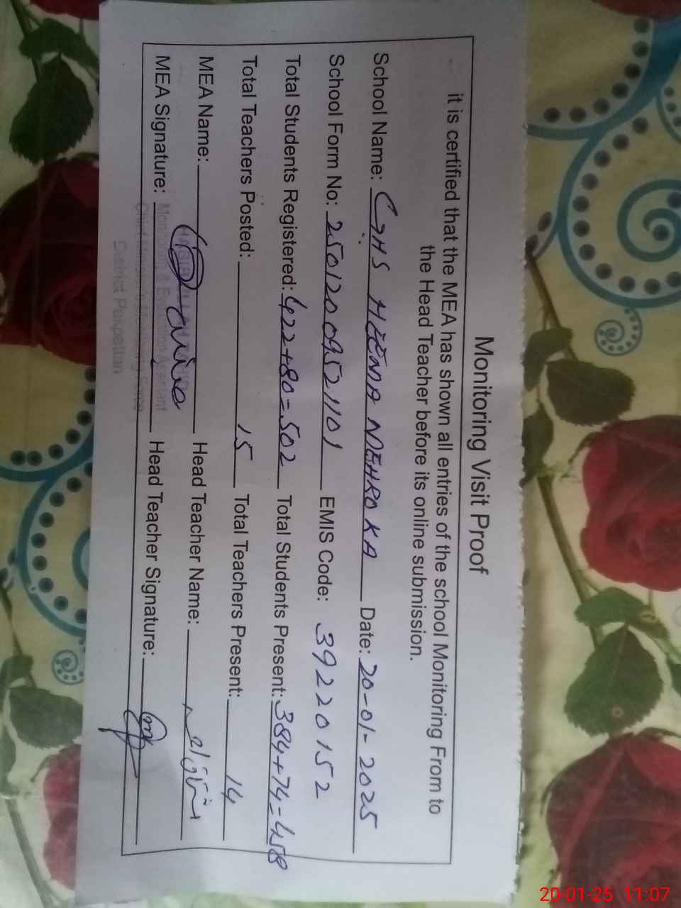 | Attendance Register | Head Teacher | MEA with School | Visit Proof |