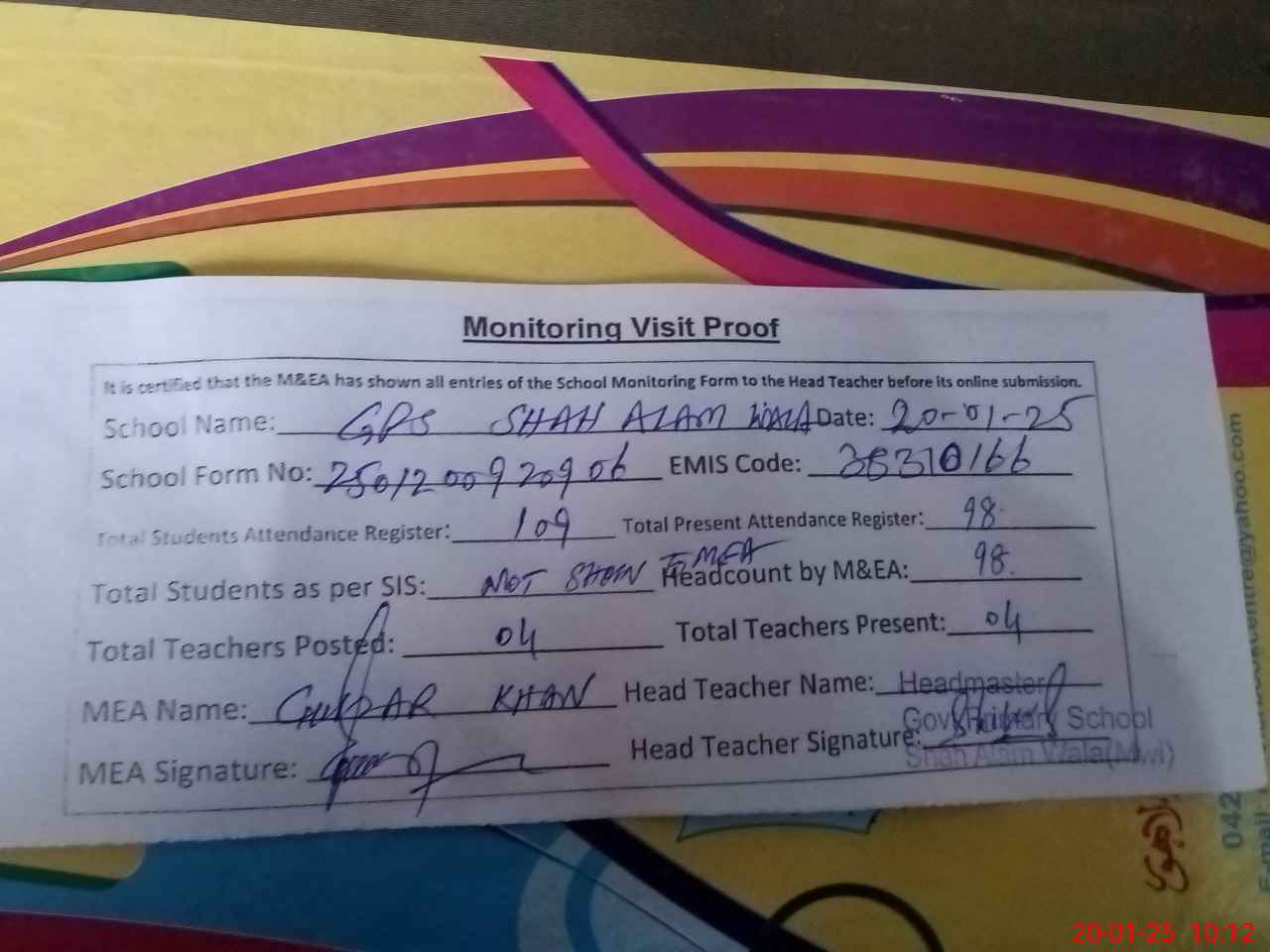| Attendance Register | Head Teacher | MEA with School | Visit Proof |