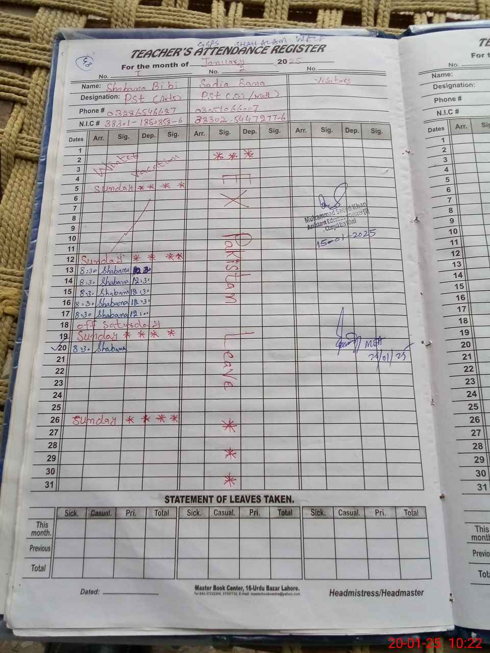 | CNIC | Full Name | Designation | R/C | Absence During Last Calender Month |